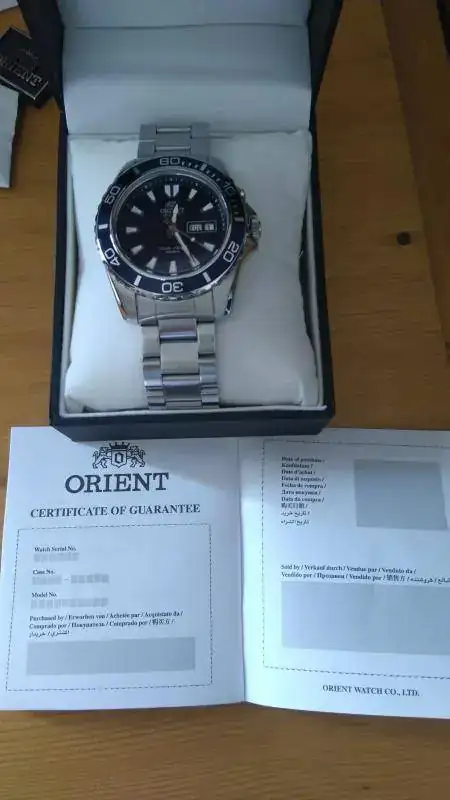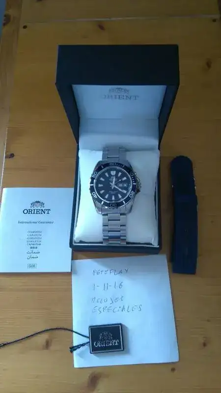 El reloj, a pesar de estar usado esté en muy buen estado, y sin apenas marcas reseñables, simplemente algunas pequeñas marcas de uso casi inapreciables en los terminales. Quizás lo más significativo sea una marca en el bisel, al lado del 6 del 60, que he intentado sacar en las fotos, creo que en una se aprecia un poco, pero en vivo casi ni se ve. También, cómo no, el armis a veces parece un sonajero, sobre todo los terminales, que cogen holgura muy rápido (típico de estos Mako II); sé que se puede solucionar cambiando los pasadores por unos más gruesos, pero como eso no me ha molestado nunca, pues no lo he hecho, pero lo aviso para que no haya sorpresas. Decir que lo que aparece en el cristal son unas pequeñas motas de polvo, el cristal está perfecto. Lo compré en 2013 en una web de artículos outlet, dreivip.com, aunque la tarjeta de garantía me vino sin fechar ni sellar, y no conservo la factura. Adjunto (opcional) una nato azul de dos piezas y sin ninguna puesta, que le queda estupenda para el verano (próximo