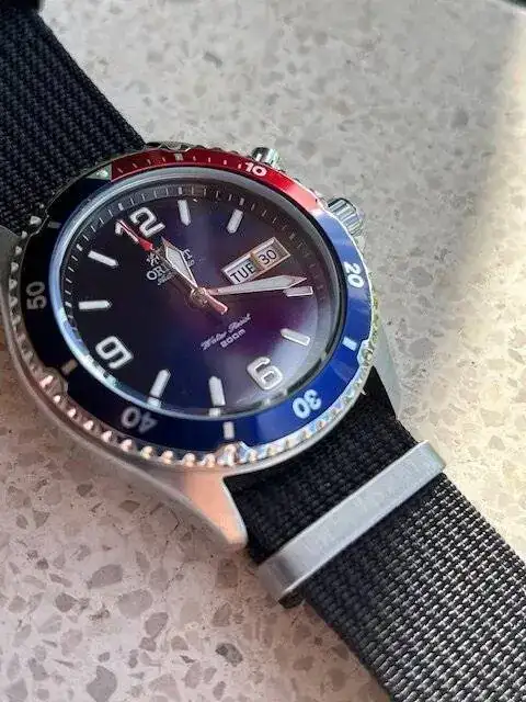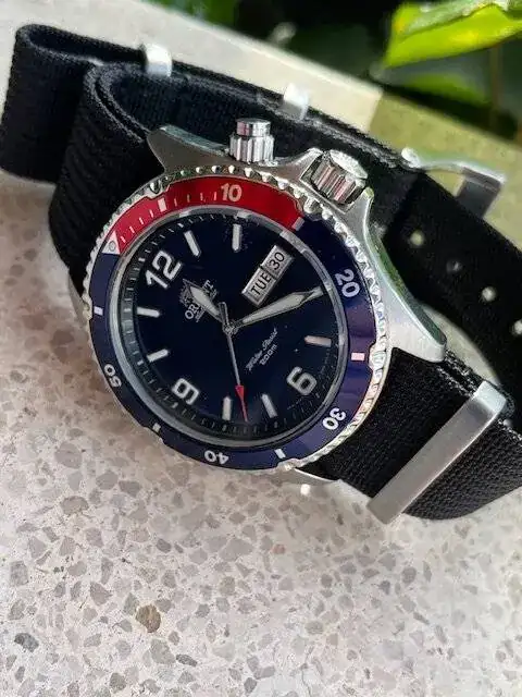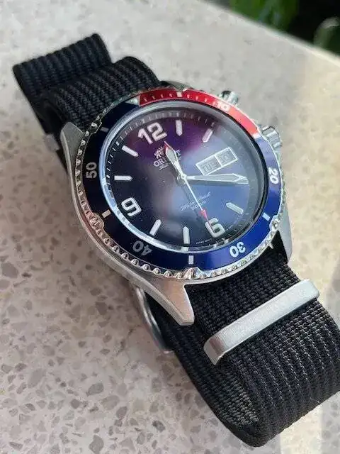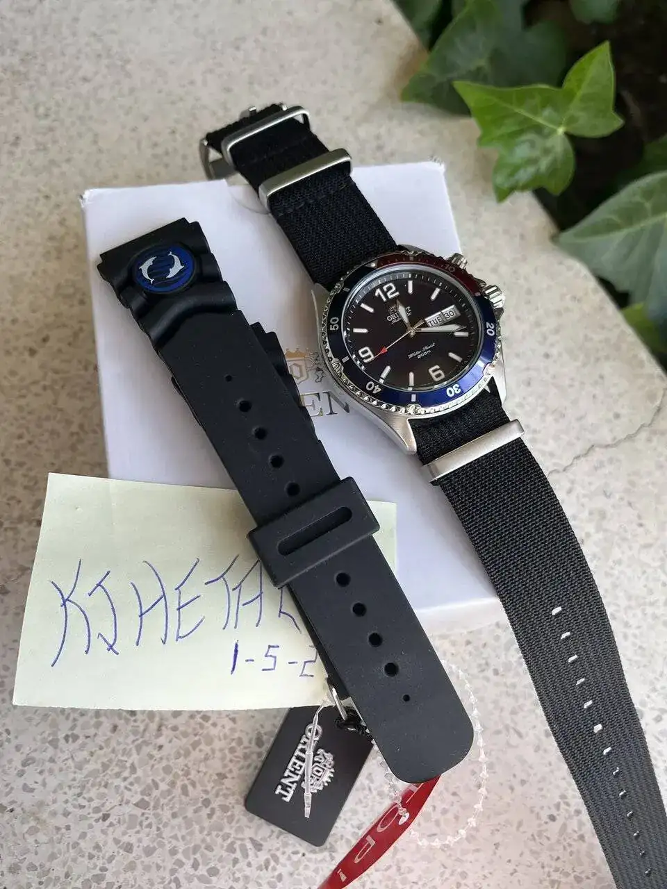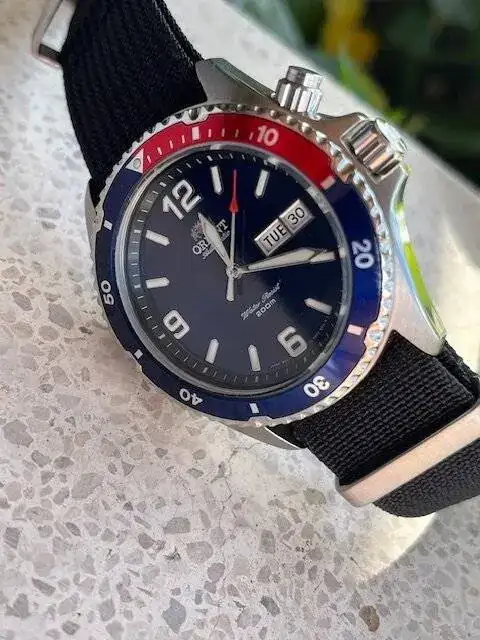 Vendo este Orient Mako de primera generación versión Pepsi. El reloj tiene 4omm de diámetro, tiene corona roscada. Se encuentra en un estado de reestrenoy se entrega con su caucho original y una nato negra que se ve en las fotos, es una pieza que se esta volviendo complicada dado que ha debido ser descatalogada. Lleva sus papeles correspondientes y caja.