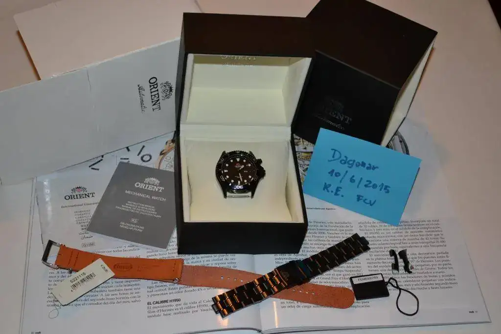 Caja y brazalete de acero con tratamiento PVD, calibre Orient 46943 made in Japan con 21600 alternancias/hora , fecha y dia de la semana...