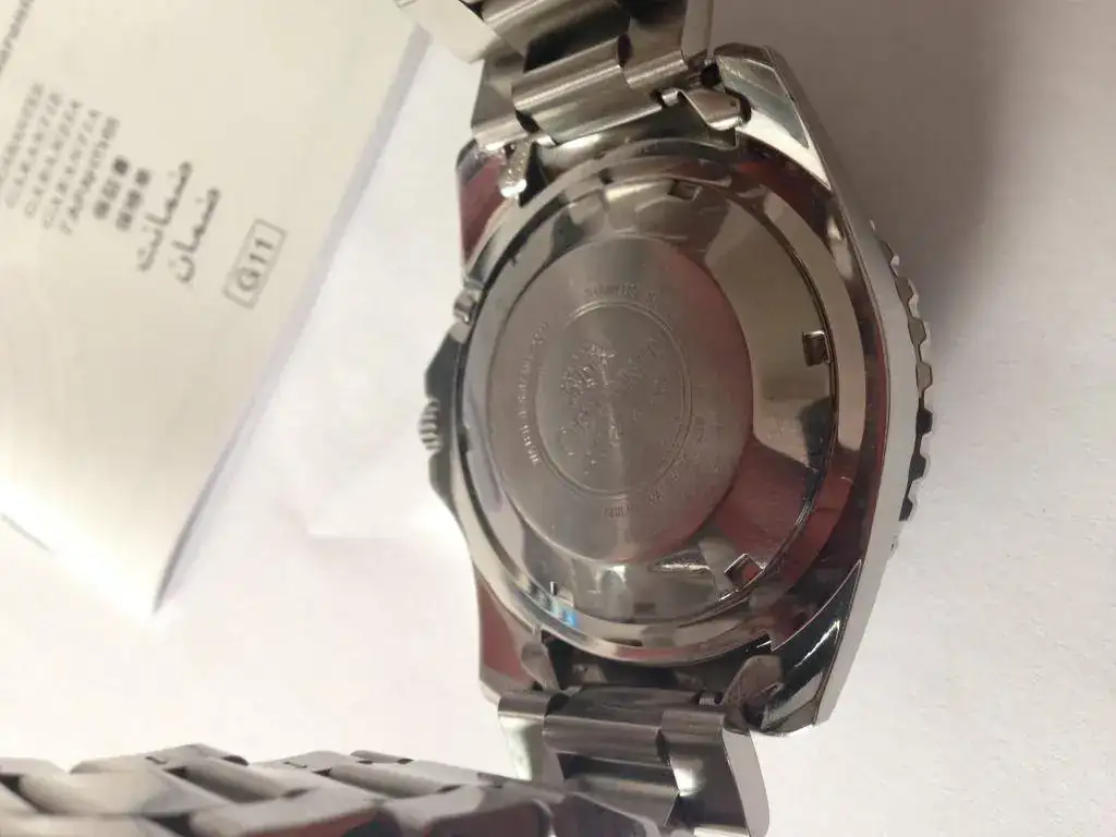 La caja tiene unas medidas de un reloj contundente pero que se adapta a cualquier muñeca estas medidas son las siguientes: Ancho entre asas de 22mm, grosor de caja 13,5mm, de zapata a zapata 50mm y diámetro de caja sin corona 44,5mm. La caja presenta algunos pelillos de cambio de correa y de uso pero nada grave.