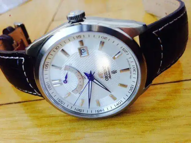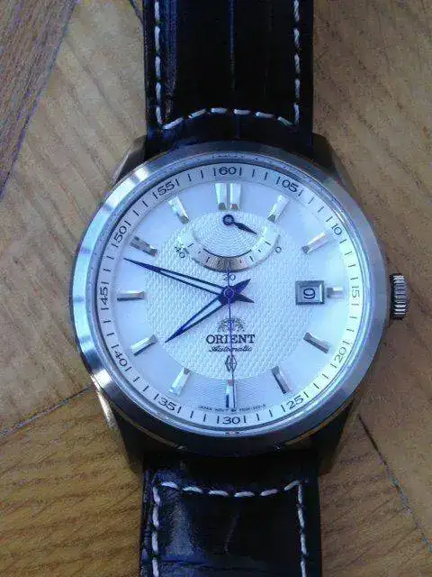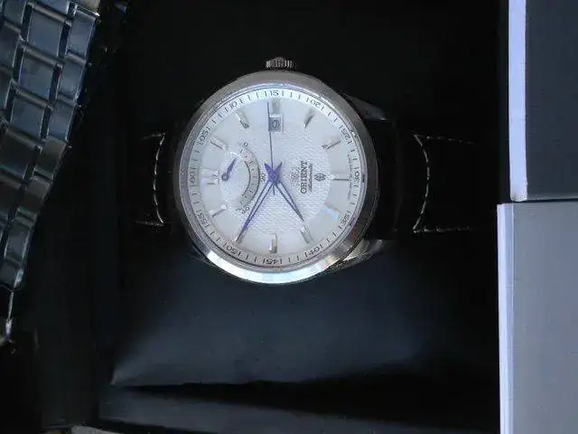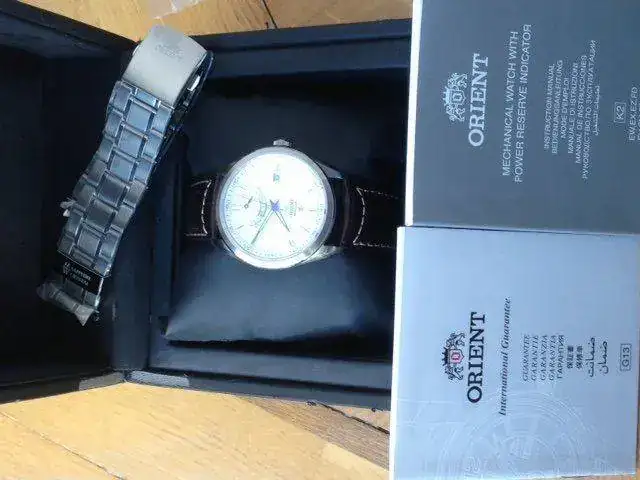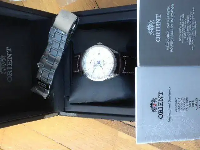 Vendo este Orient Reserva de marcha. El reloj es un clasico de la marca tiene un tamaño de 40 mm, agujas azules, cristal de zafiro fondo visto.Indicar que el reloj no tiene la opcion de carga manual para la reserva de marcha. No presenta ningun tipo de marca y va acompañano de su Armys original a estrenar y de una correa de cuero morellato con un par de puestas. El reloj esta completo con toda sus caja y papeles.