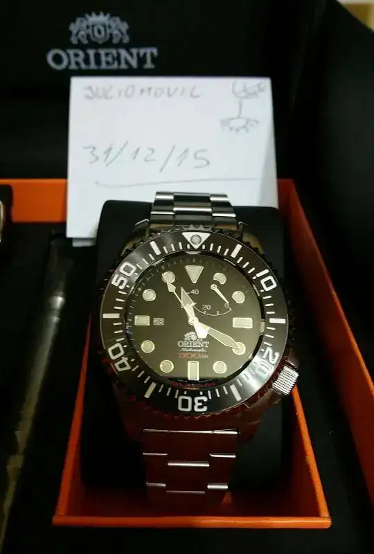 Movimiento: Automático ORIENT caliber 40N5A. Horas, minutos, segundos, fecha. Indicador de reserva de marcha.