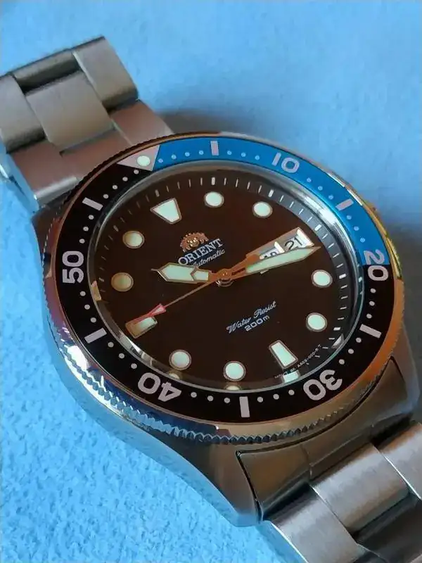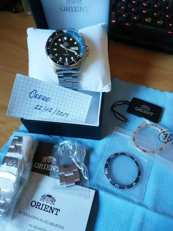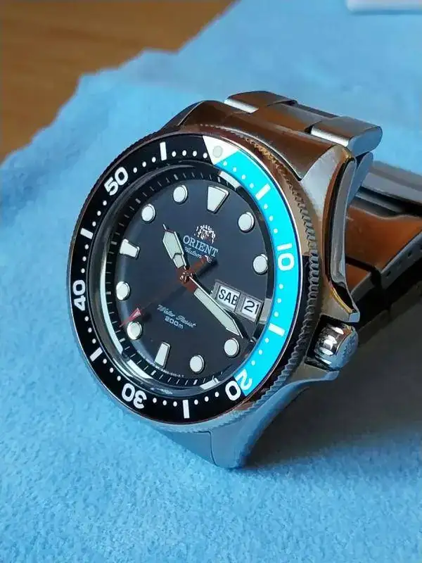 - Reloj Orient Ray II montado con bisel Yobookies (es el bisel específico para el Mako/Ray), insert genérico negro/azul y armis original de Orient Mako con todos los eslabones.