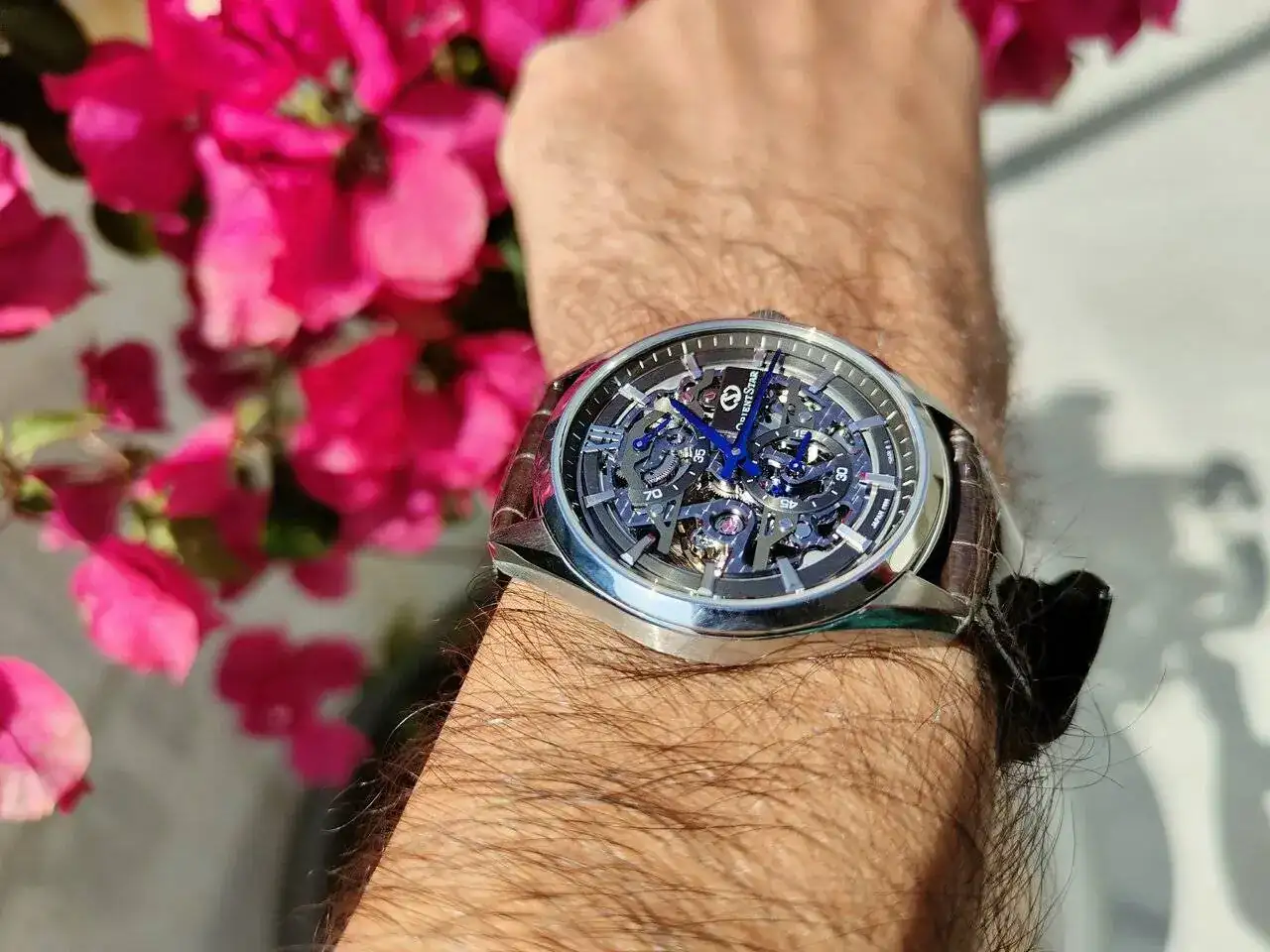 Pasamos a la esfera que es lo más llamativo del reloj y lo primero que llama la atención es que para ser un Skeleton no tiene mala legibilidad, gracias a las maravillosas agujas azules (no son pintadas ) que me encantan y dependiendo cómo le dé la luz son oscuras o un azul eléctrico.
