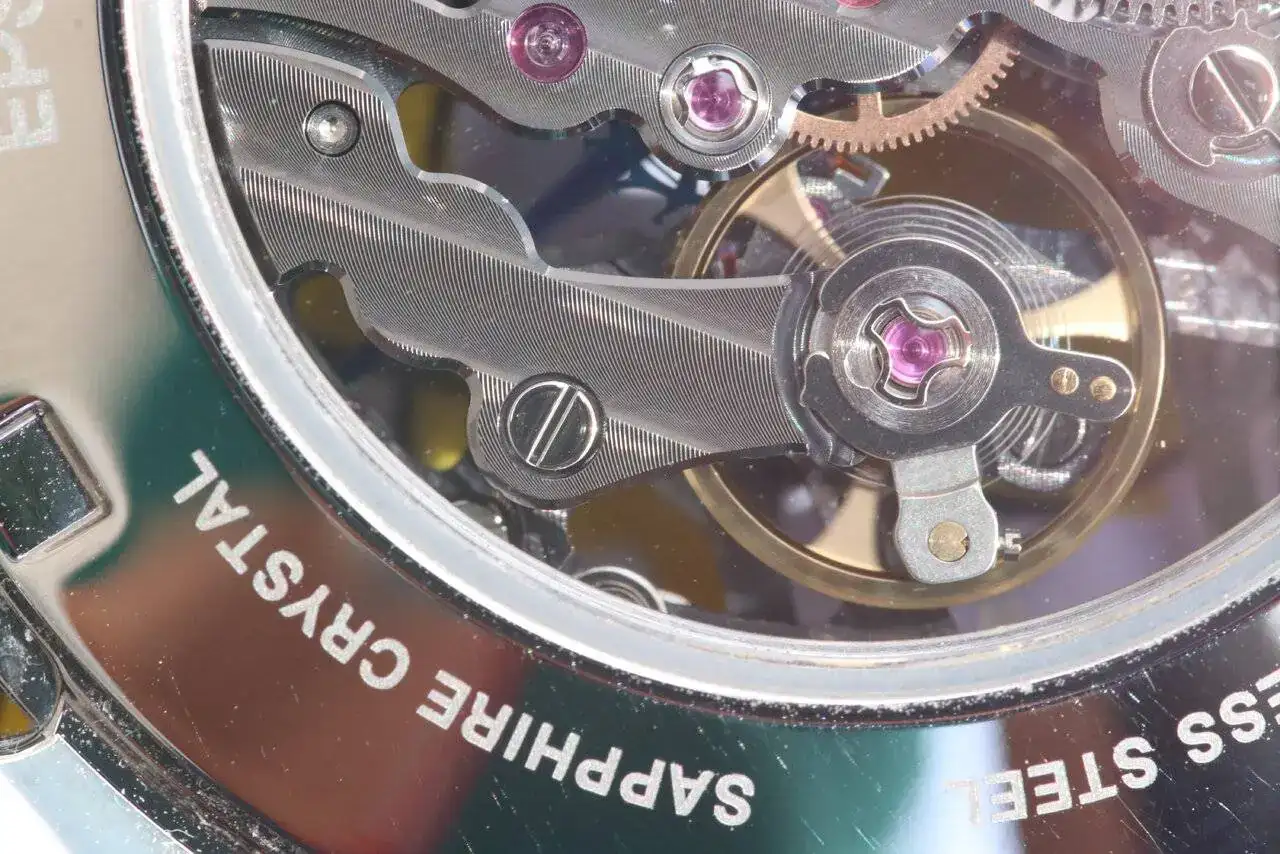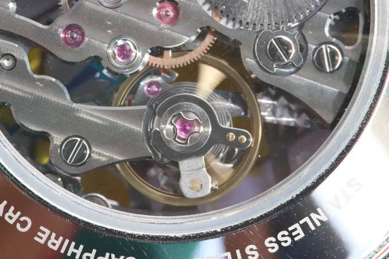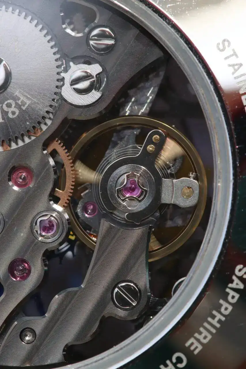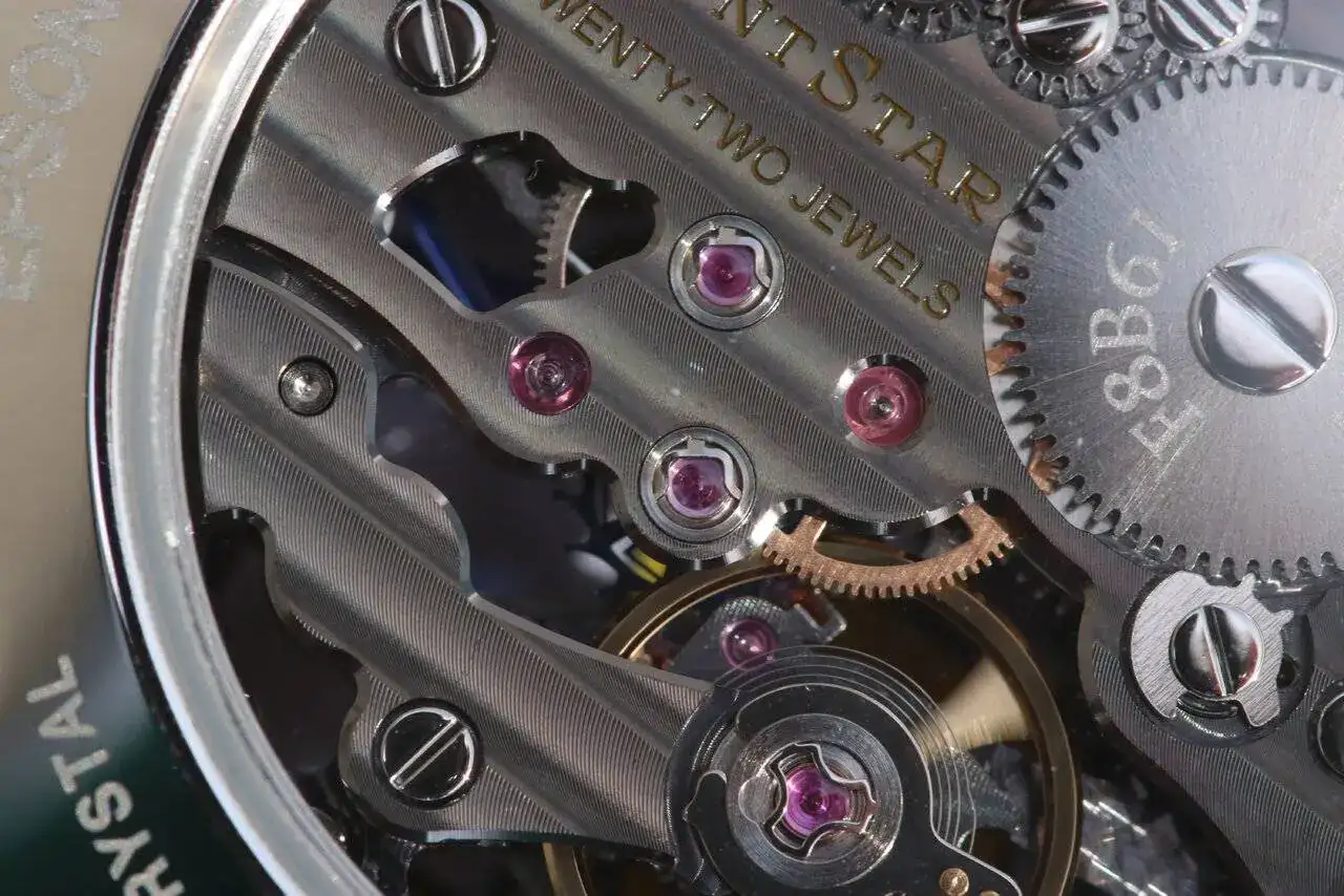 Lleva un calibre F8B61 mecánico de remonte manual con reserva de marcha de 70h, da gusto darle cuerda. Precisión de +15 -5 seg/día. Lleva rueda de escape de silicio también de color azul como las agujas. Se utiliza la tecnología patentada por Epsom llamada MENS (Micro Electro Mechanical Systems). Al ser Skeleton se puede ver el calibre