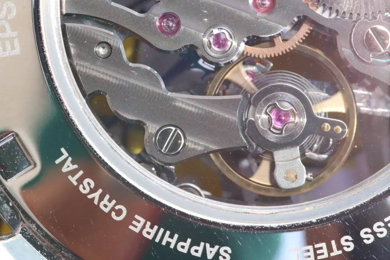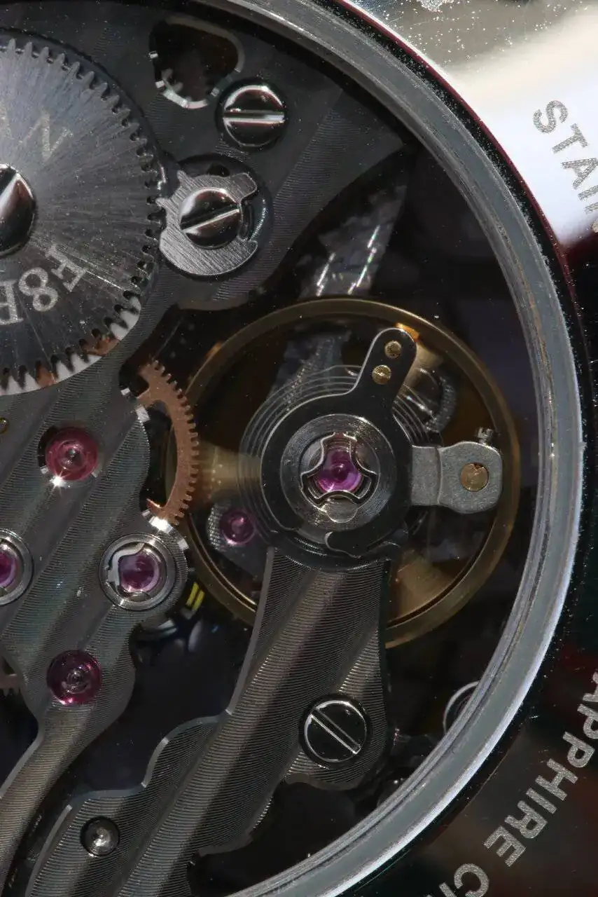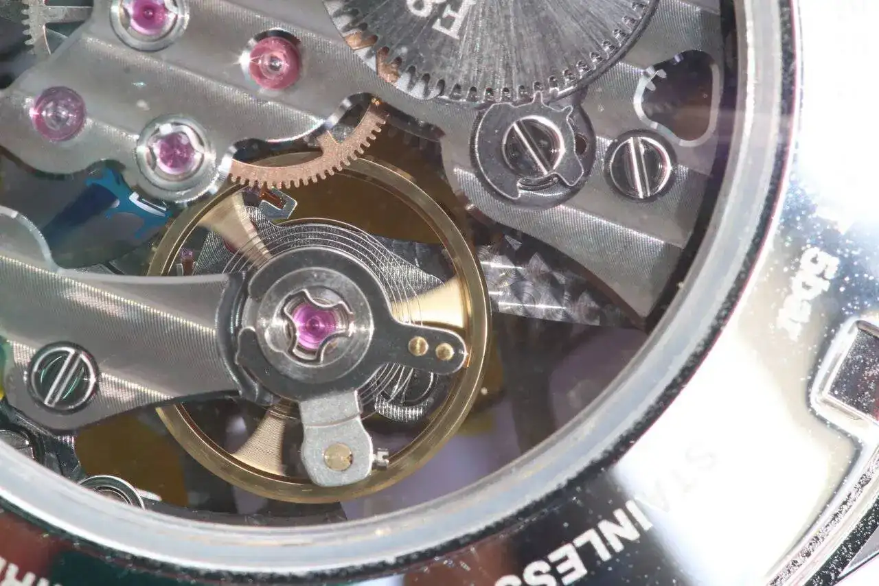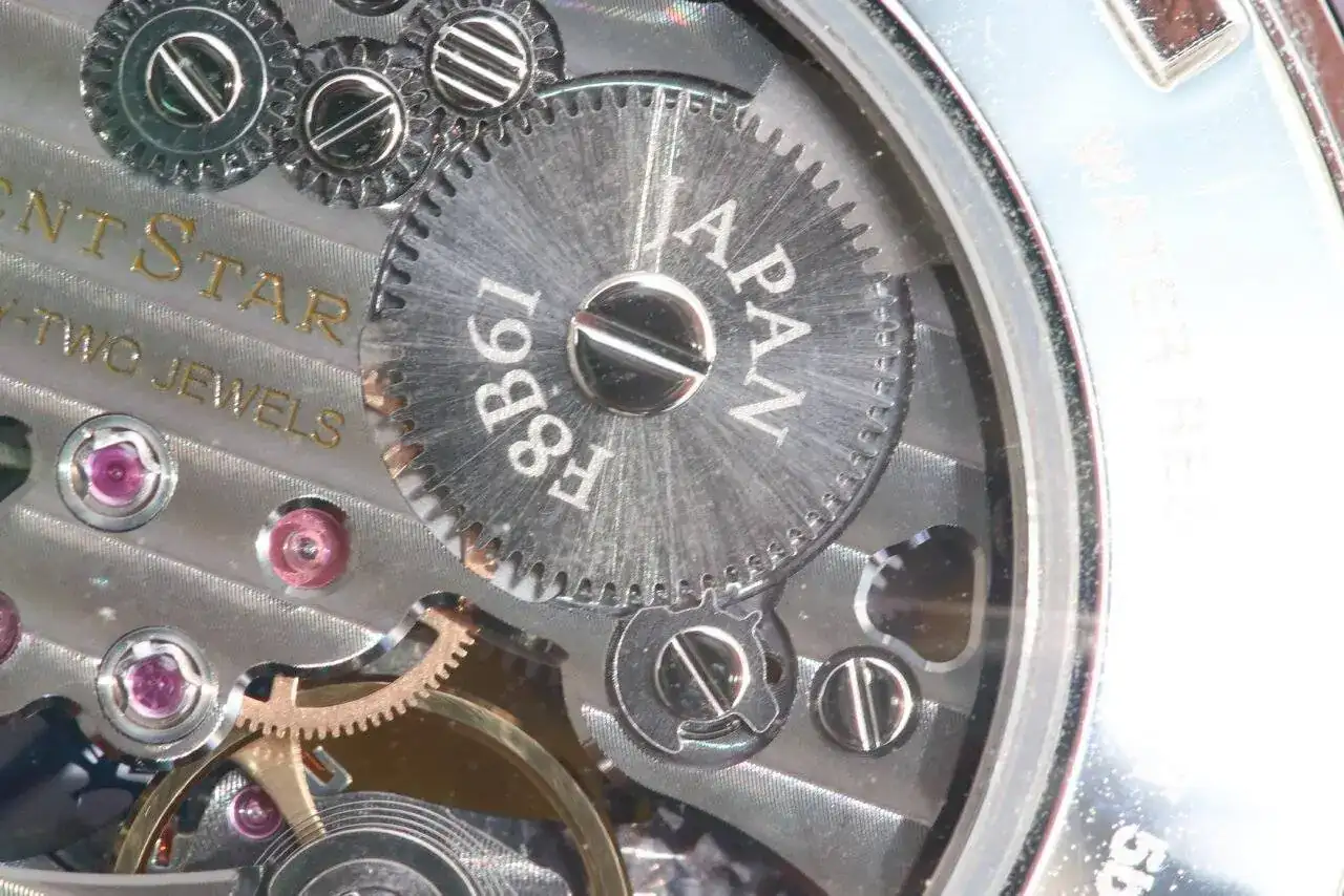 Lleva un calibre F8B61 mecánico de remonte manual con reserva de marcha de 70h, da gusto darle cuerda. Precisión de +15 -5 seg/día. Lleva rueda de escape de silicio también de color azul como las agujas. Se utiliza la tecnología patentada por Epsom llamada MENS (Micro Electro Mechanical Systems). Al ser Skeleton se puede ver el calibre