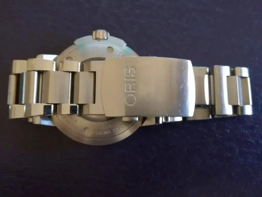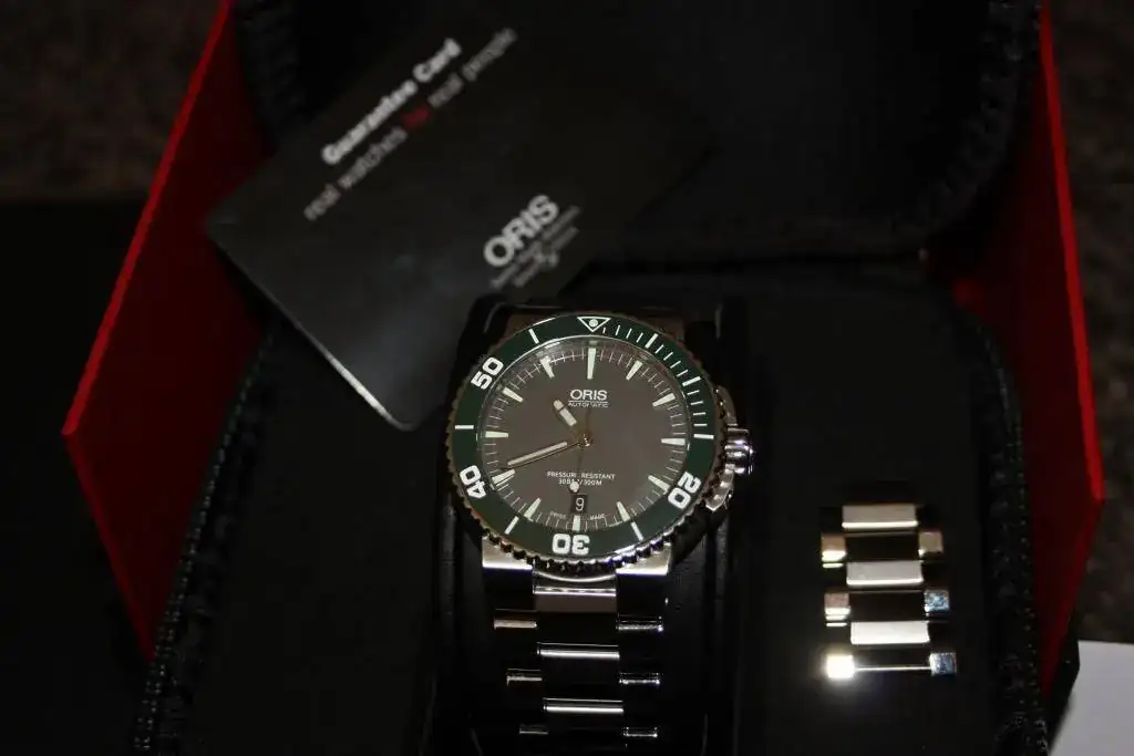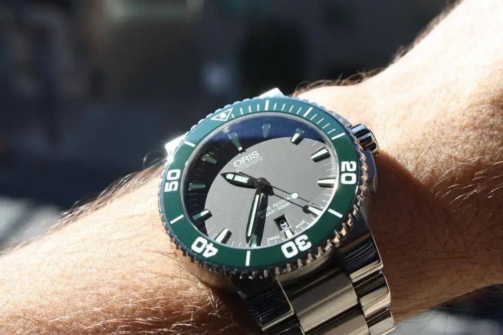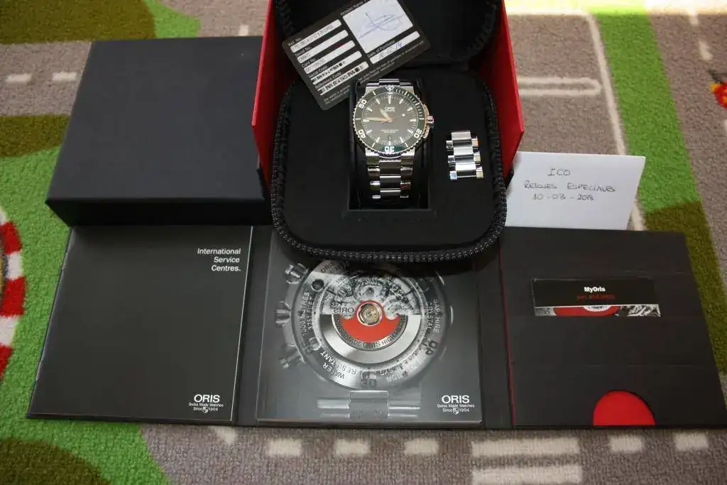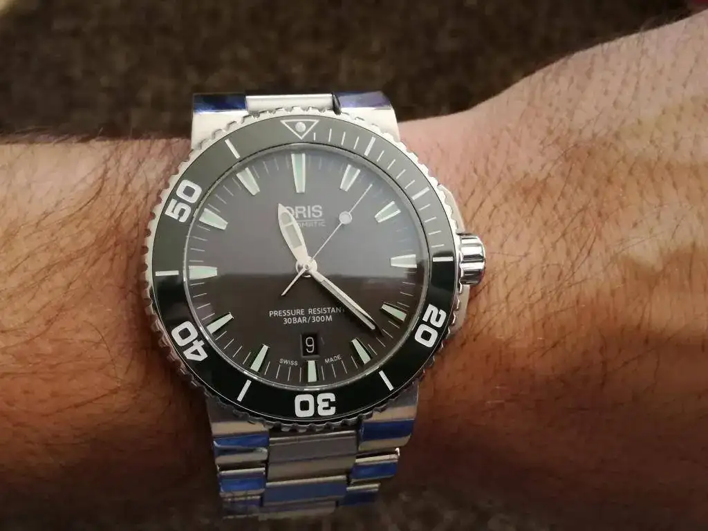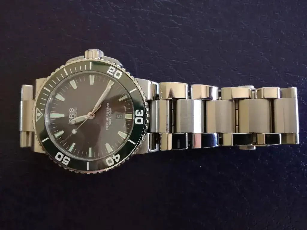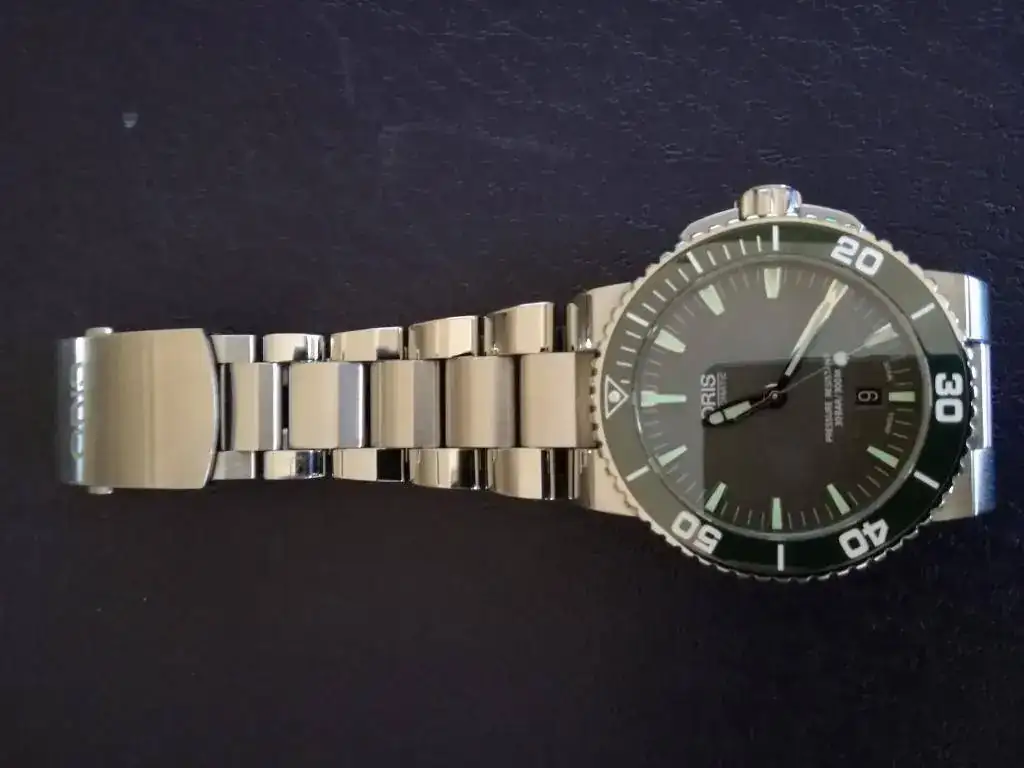 Se trata de uno ORIS AQUIS 300 m con bisel cerámico verde y esfera gris, para mi gusto es una preciosidad, pero esos 43 mm que en la tienda no se me hacían grandes tras un día de uso he visto que sí y antes de tenerlo 6 meses en la caja prefiero que salga.
