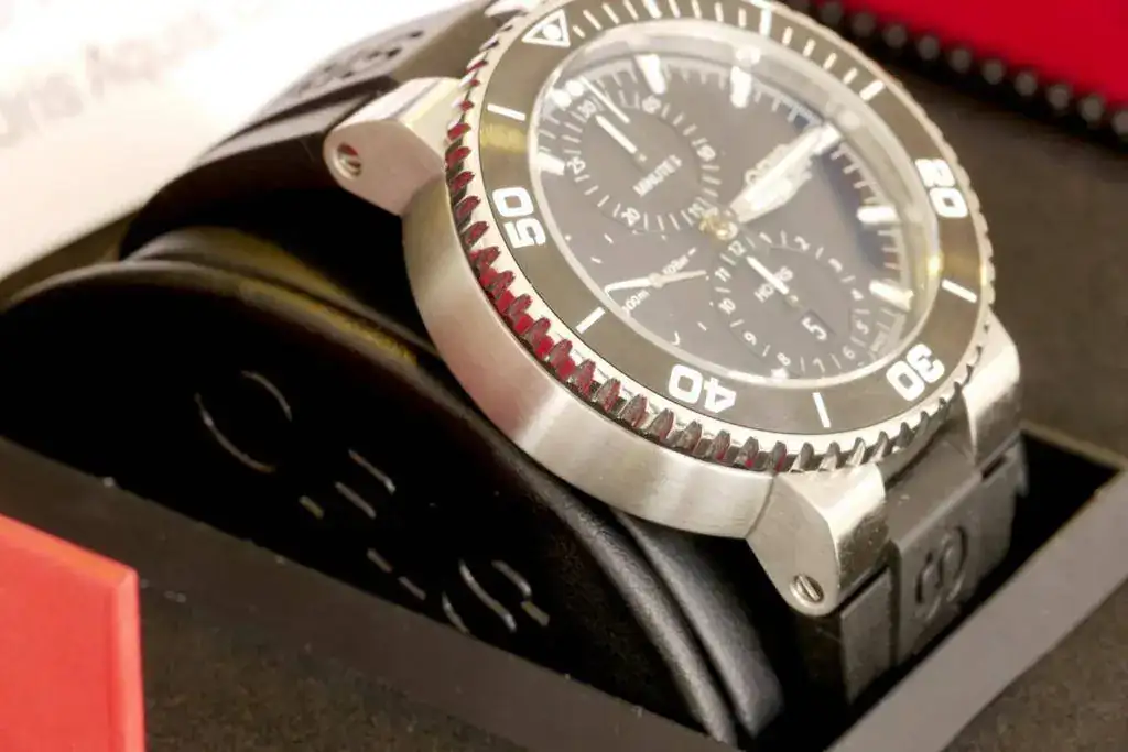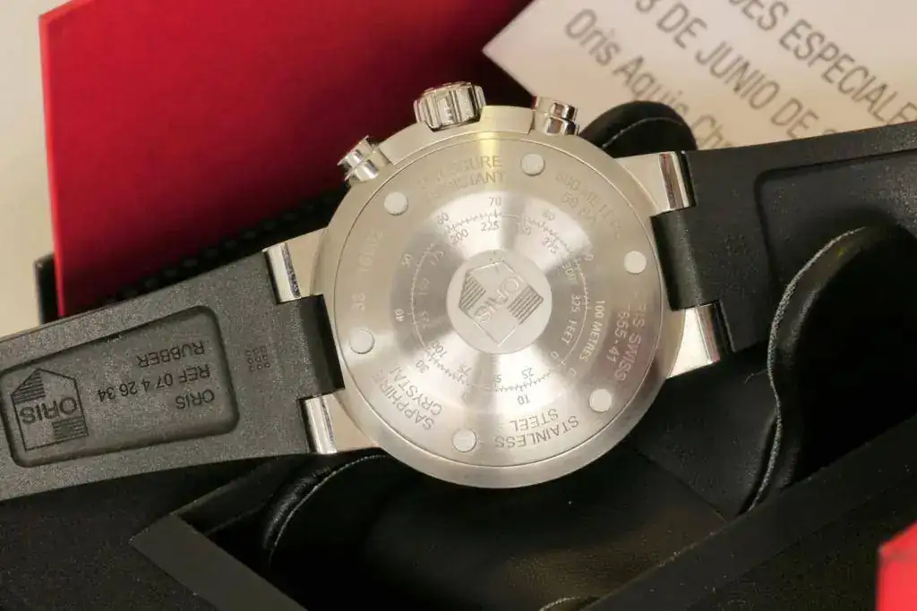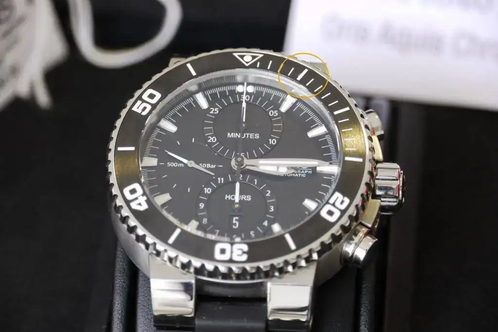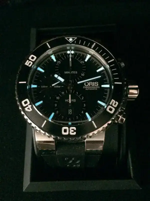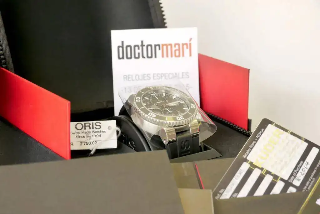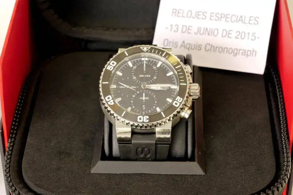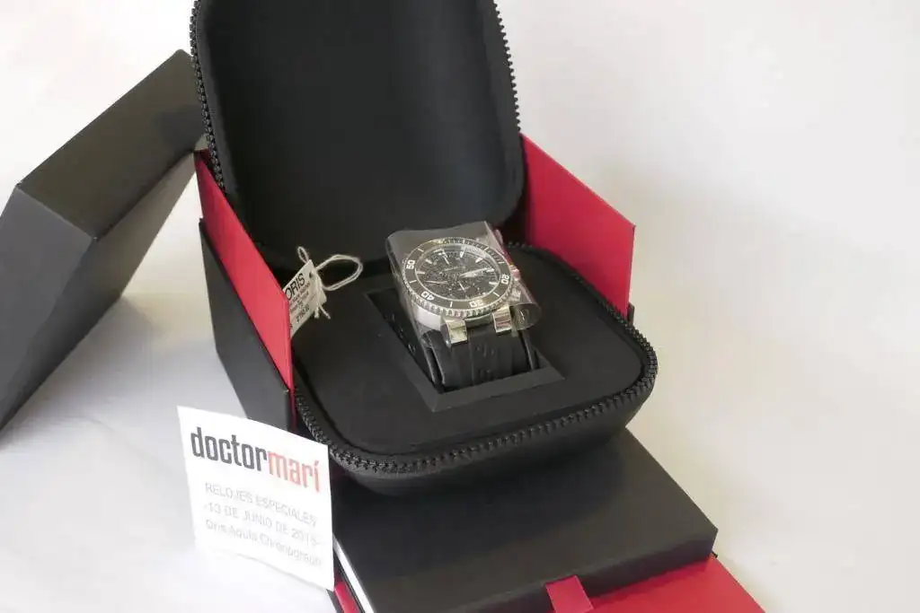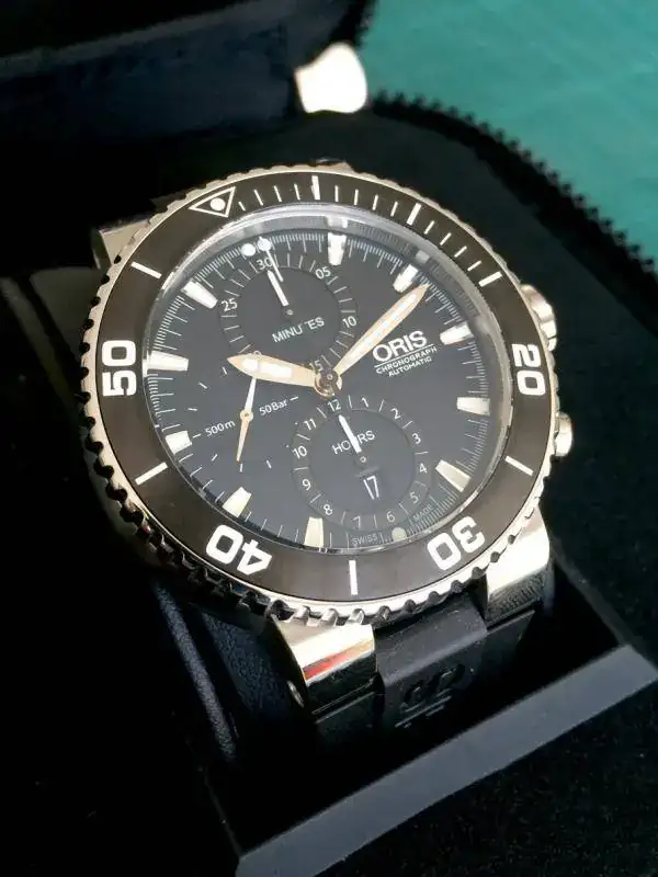 Sintiéndolo mucho pongo a la venta mi ORIS AQUIS CHRONO de reestreno total. El reloj no tiene ni un año de compra y apenas me lo he puesto 3 veces, aún conserva todos los plásticos y etiquetas originales, por lo que le pongo una NOTA de 9,5 sobre 10. Sólo destacar una pequeñísima manchita blanca en el primer palito grande del bisel rotatorio, sobre la una (adjunto foto) apenas se ve y creo que es una manchita porque es blanca, pero yo prefiero no rascar. Por lo demás, decir que no tiene ni los típicos pelillos en el cierre. LO DICHO REESTRENO TOTAL. Las fotos no hacen justicia al reloj, pero la fotografía no es mi fuerte.