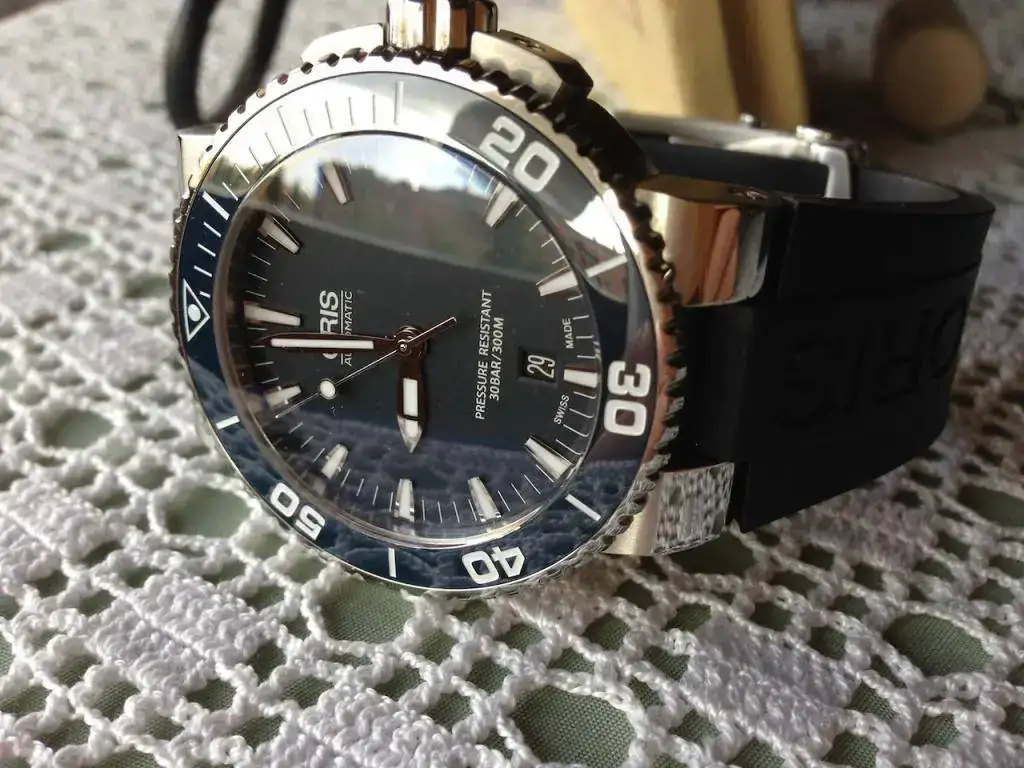 Pongo en venta este bonito Oris Aquis en muy buen estado. El reloj es de Noviembre del 2013 y tiene solamente pelillos en las zonas pulidas más visibles en el cierre.