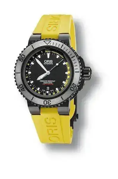Ahora Oris agrega una segunda versión a la familia de este famoso reloj de buceo. El nuevo reloj cuenta con correa de caucho amarilla que destaca por dos revolucionarias innovaciones adicionales Oris – el anclaje de seguridad que impide que la correa se abra, incluso tras un fuerte impacto; y el cierre corredizo, que permite al usuario ajustar el tamaño de la correa sin desabrochar el cierre.La caja de acero de 46 mm del reloj exhibe un resistente y deportivo acabado en DLC negro así como un bisel giratorio unidireccional con revestimiento de tungsteno, un material tan firme como una esmeralda. El Calibre 733 automático de Oris, de base Sellita SW 200-1, late en el interior del reloj ofreciendo energía a la fecha, en una ventanilla a las 6 horas, y a la reserva de marcha de 38 horas.
