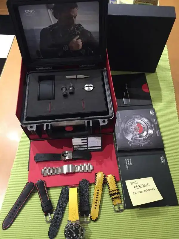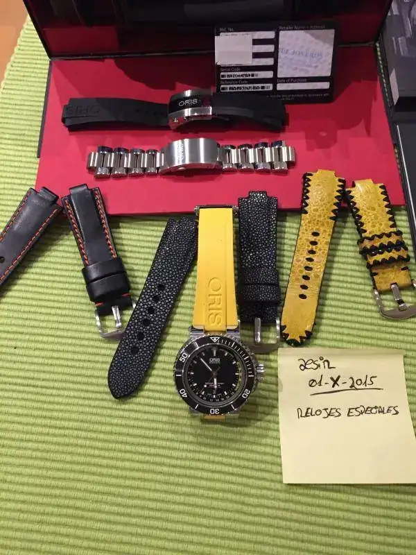 A las 2 que vienen de serie (caucho negra y armis), hay que añadir otra de caucho amarilla de Oris con su depilo, y tres más de cuero. Una amarilla de piel de sapo y otras 2 que están SIN ESTRENAR que hizo Jacobo hace pocas fechas.