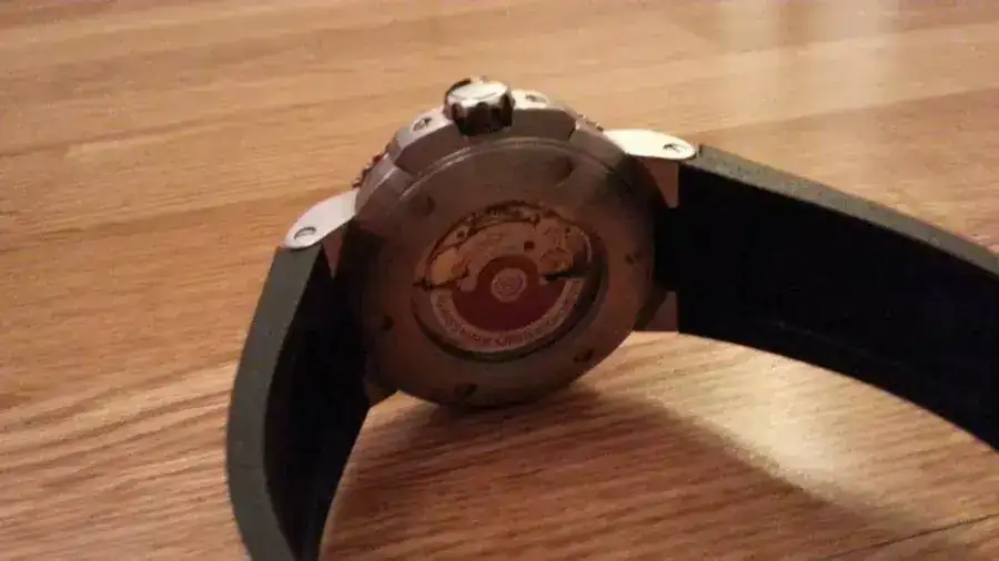 CAJA: De acero con anillo superior multipiezas acero inoxidable, escala minutera cerámica, totalmente estanca, serial y marca registrada en parte posterior. Corona roscada a la caja.