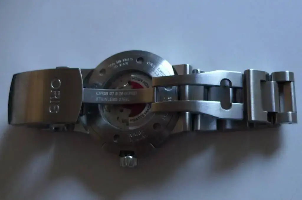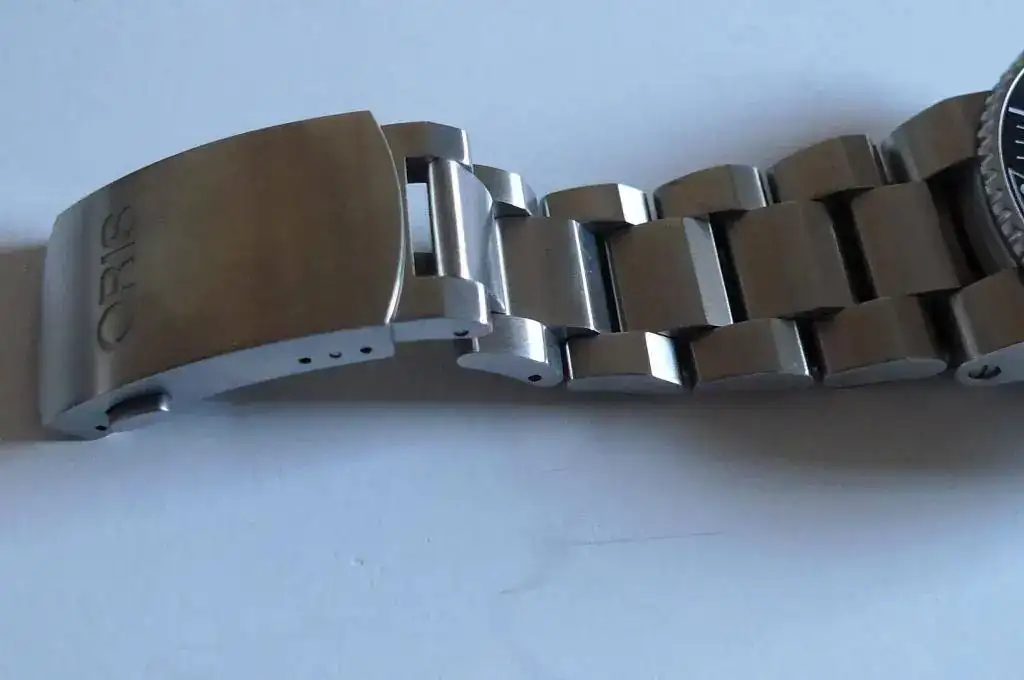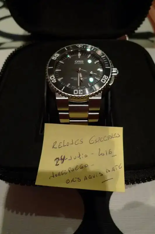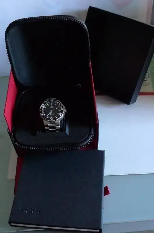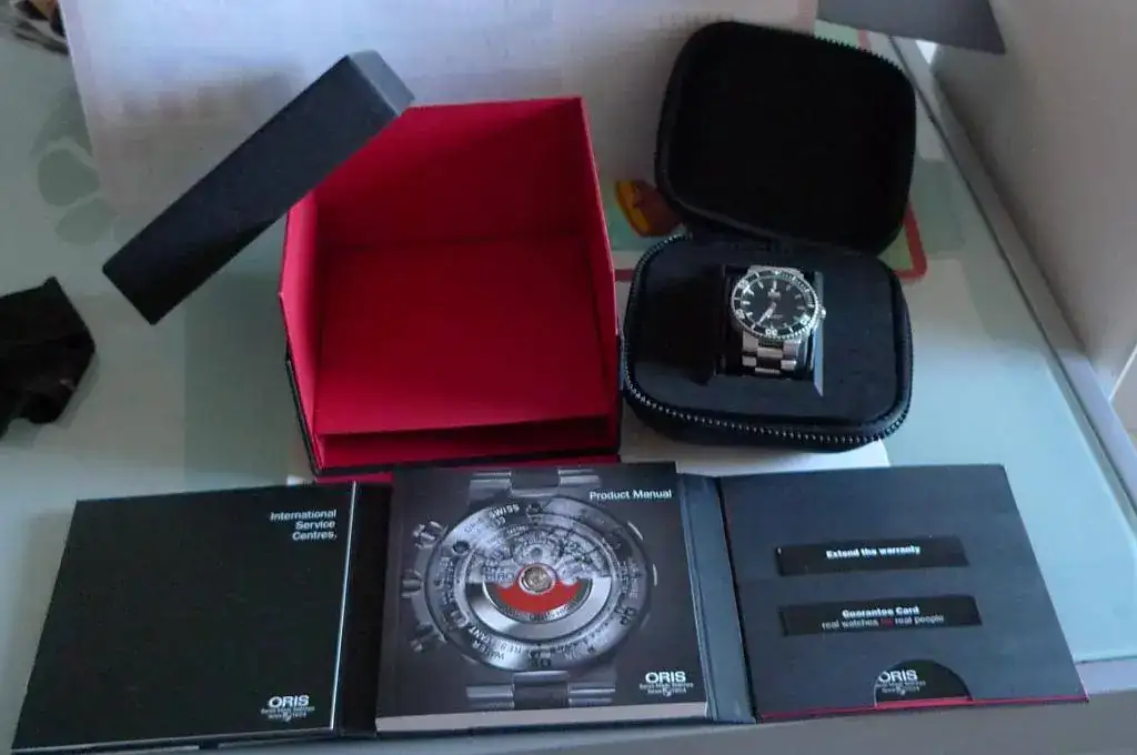 Completo con toda su dotacion de caja exterior de carton,caja interior,cartera portadocumentos con manuales de instrucciones,tarjeta My ORIS y tarjeta de Garantia sellada y fechada en C.O. Nacional ademas de incluir los eslabones restantes del brazalete.