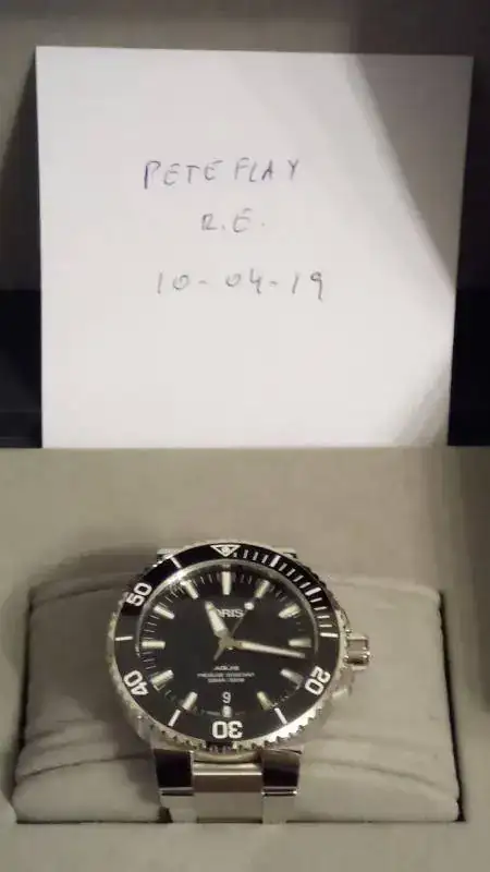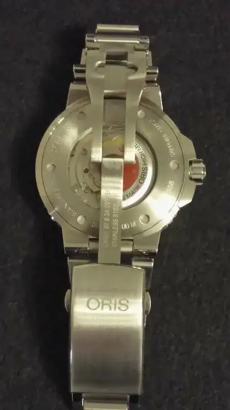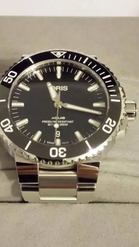 Ahora al lío. Saco a la venta con muchas, muchísimas, dudas mi casi recién comprado Oris Aquis Date negro (versión 2018) de 43,5mm. Es un relojazo por los cuatro costados, pero se me ha metido otro en la cabeza y ambos no puede ser. El reloj está comprado en CO nacional a finales del pasado mes de enero, con lo cual le queda mucha garantía por delante (además, activé el tercer año en myOris). En estos meses desde que lo tengo lo habré usado en total unos 15 días, y no de manera seguida, así que está perfecto (salvo algún pelillo o pequeña marca casi imperceptible en el cierre, y quizás alguna en el armis que yo no haya visto). Sus características creo que son de sobra conocidas: zafiro abombado a doble cara, AR interior, bisel cerámico, 300m. El sellita SW200 que monta me ha venido muy bien ajustado, desvía unos 5 segundos al día.