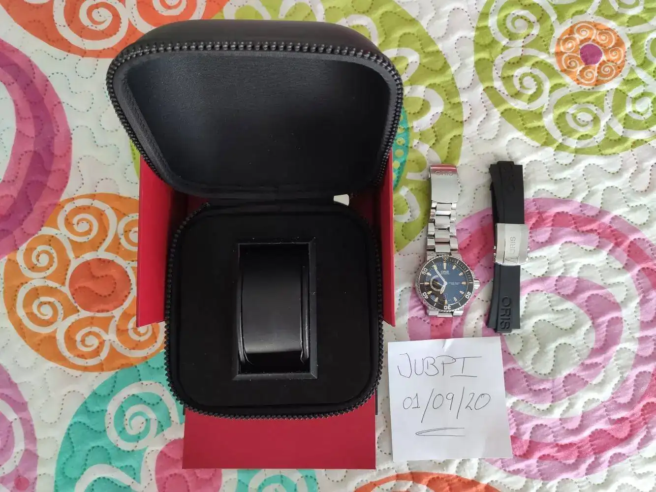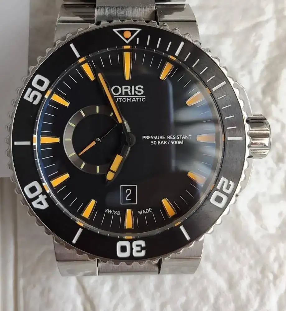 Como dijo aquel: "dejen salir antes de entrar" y como tengo varios modelos que quiero probar en mente pues vamos a aligerar la caja. Hoy empiezo por este fantástico Oris Aquis Small Seconds Date. Como veis el reloj esta estupendo, pero esta claro que tiene mariquitas de uso, todas superficiales y ninguna en bisel o cristal solo en cierre y un pilen en un lateral de la caja. El reloj va con su dotación completa ademas del armis que le compre aparte y ya solo el vale mas de 100€