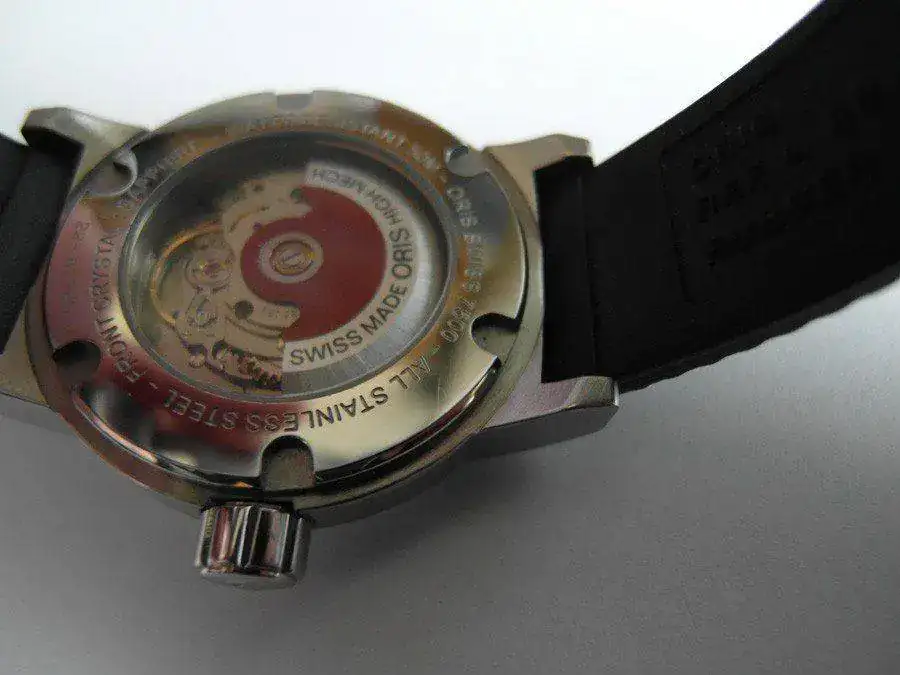 Lleva cristal de zafiro, fondo visto, calibre oris 635, correa de caucho cortada para 17 maximo.