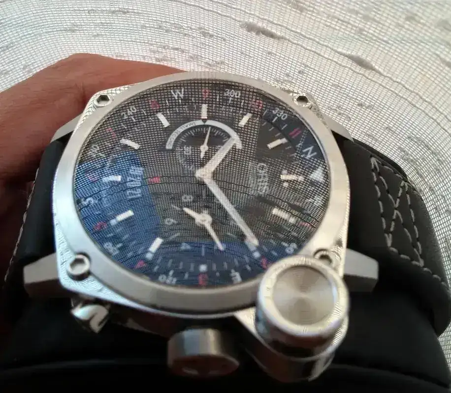 - Funciones: hora, minutos, segundos, fecha (a las 6), indicador noche y día en ventana subesfera de las 3, GMT segunda y tercera zona horaria,.