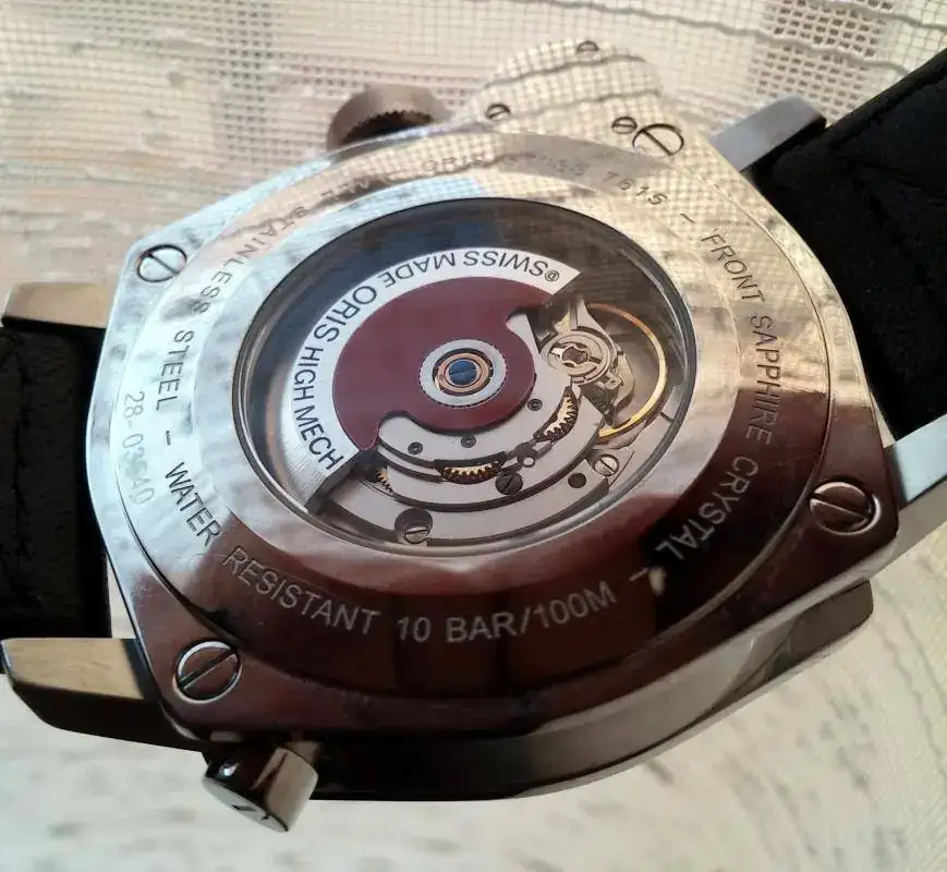 - Movimiento mecánico automático Oris 690 (base ETA 2836-2) con su característico rotor rojo . Dos horarios y Small Seconds.