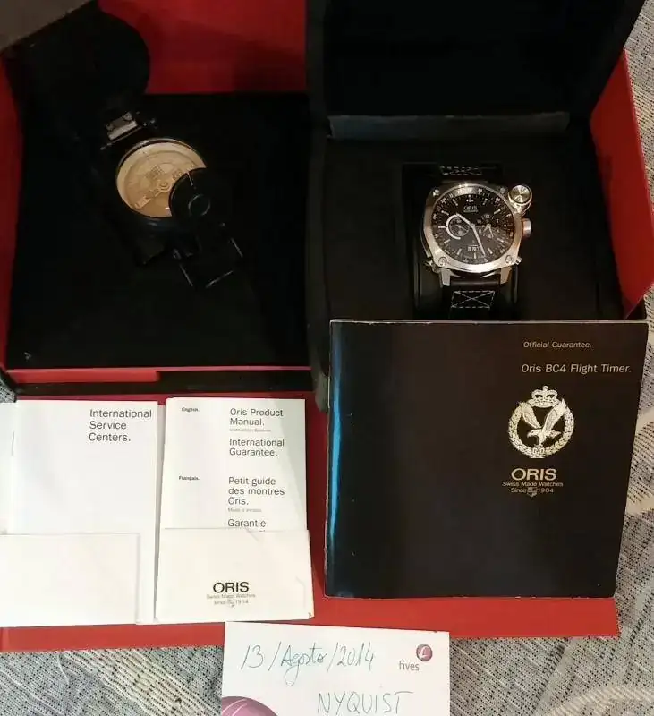Presenta un buen estado estético y de marcha (-4 segundos aprox.) con sus leves marcas propias de un uso esporádico y civilizado destacando un rasponcito en el bisel a la altura del 5 y un arañazo en la parte pulida del fondo que se habrá producido con el propio cierre, no es nada serio y seguro que un poquito de Cape Cod lo eliminaría, pero lo digo por si acaso. Se entrega con todo lo que traía de casa, caja interior con forma de instrumento de vuelo, Oris Product Manual/Garantía Internacional sellada, librito Oris BC4 Flight Timer, librito de Centros Oris internacional, brújula Oris y caja negra exterior.