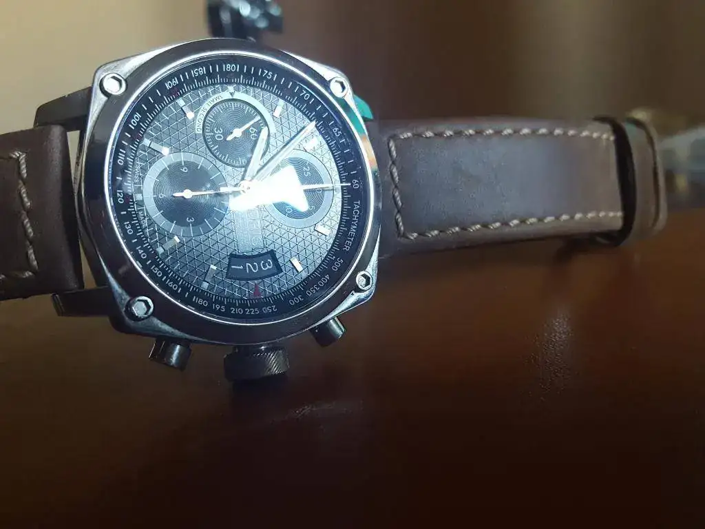 eL rELOJ ES MUY BONITO CON LA CAJA EN TONO MATE Y CEPILLADO A ESPEJO POR LA PARTE SUPERIOR QUE LE DA UN CONTRASTE PRECIOSO, Tiene pelillos y microrayas que he intentado se reflejen en las fotos - mando cuantas fotos sean necesarias por privado- Le hice una revision y puesta punto por el Maestro Pedro Izquierdo y va de fabula , aproveche para comprarle una correa gordita esetica adventurer - mas que pilot - que creo que es la que mejor le va a este reloj , la original esta usada y aunque se puede poner tiene marcas de uso por fuera no quedaria mal pero por dentro sale en alguna foto, esta pelada y esteticamente mal - tendre en cuenta esto de cara a negociar precio - la trasera es fondo visto y deja ver una maquina preciosa con el rotor en rojo y cepillado a espejo .
