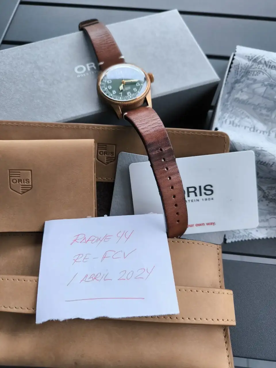 Por falta total de uso y exceso de piezas, pongo a la venta este precioso Oris Pointer Date Ed 80th con esa espectacular esfera verde y puntero de flecha roja para la indicación del día.