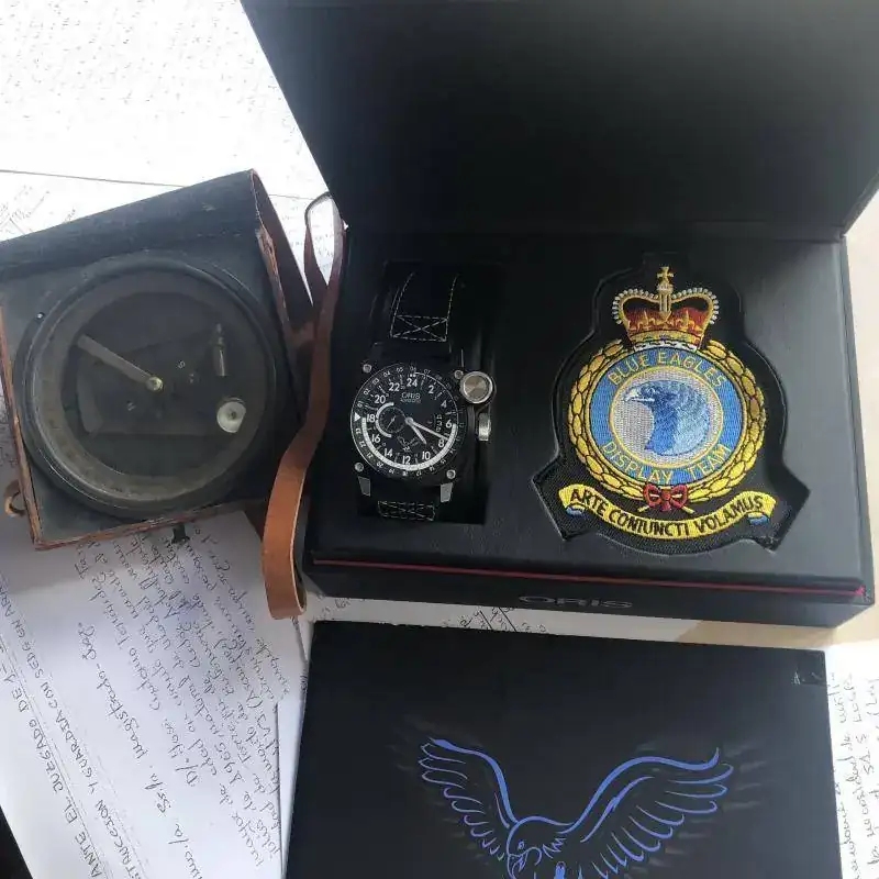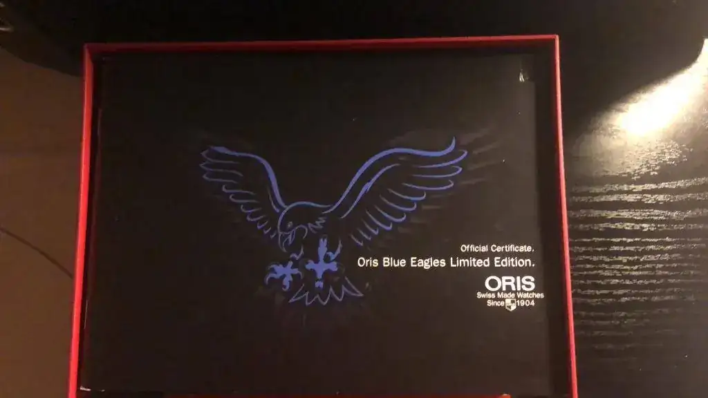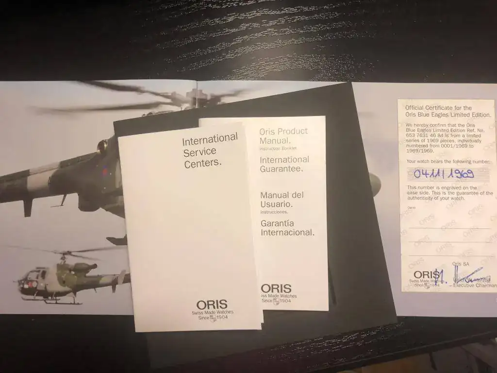 Con el reloj se incluye toda la dotación original del reloj: caja, libros, cuadernillo de la edición especial y parche conmemorativo del equipo de helicópteros de exhibición Blue Eagles.