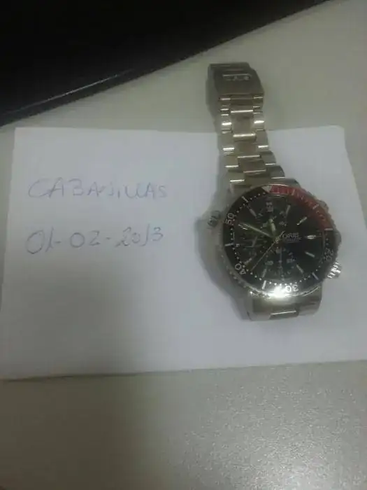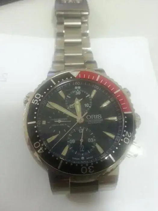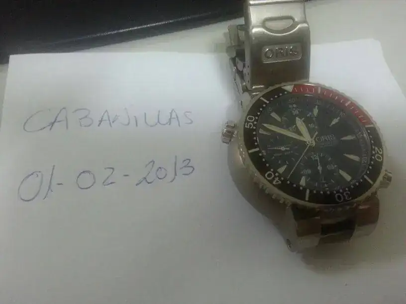 Es un crono Oris diver,con una caja de titanio de 47 mm.Al ser titanio,no pesa en la muñeca como los modelos de acero,y gracias a la forma así como piramidal ,típica de la caja de los Oris,(más ancha en la base y que se estrecha hacia el bisel),no aparenta más allá de unos 44 mm visuales.