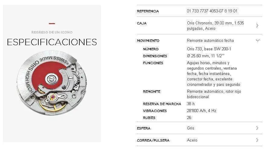 [TD]Movimiento: AUTOMATICO Oris 733, base SW 200-1[/TD]