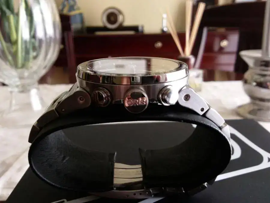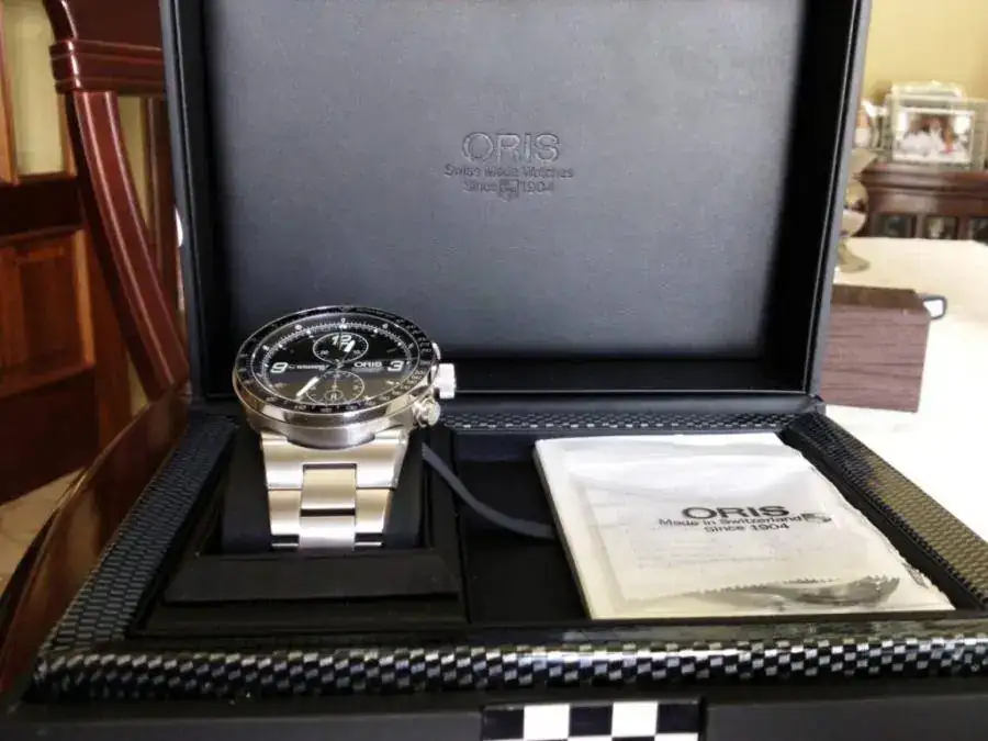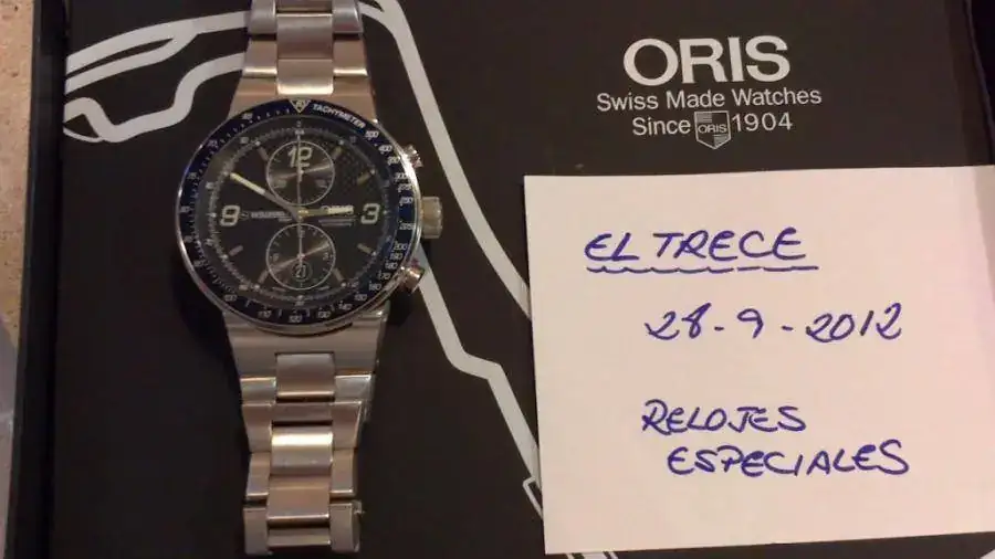 Magnífico cronómetro Oris de corte totalmente deportivo, inspirado en la Formula 1, creado con motivo de la colaboración de esta marca con la escudería Williams en Edición Limitada. Es una gozada la comodidad de su armis unido a la caja mediante asas móviles y sentir el movimiento de su gran calibre al girar su rotor. Inmejorable oportunidad de tener un gran crono con diseño/calidad y precio, totalmente revisado con muchas millas por delante únicamente para disfrutarlo.