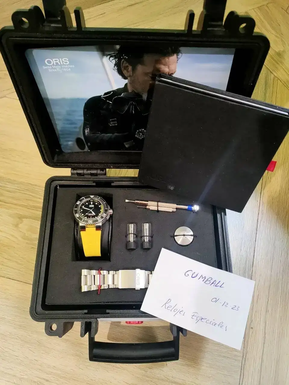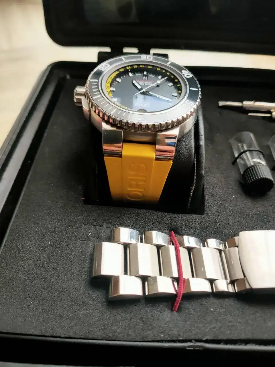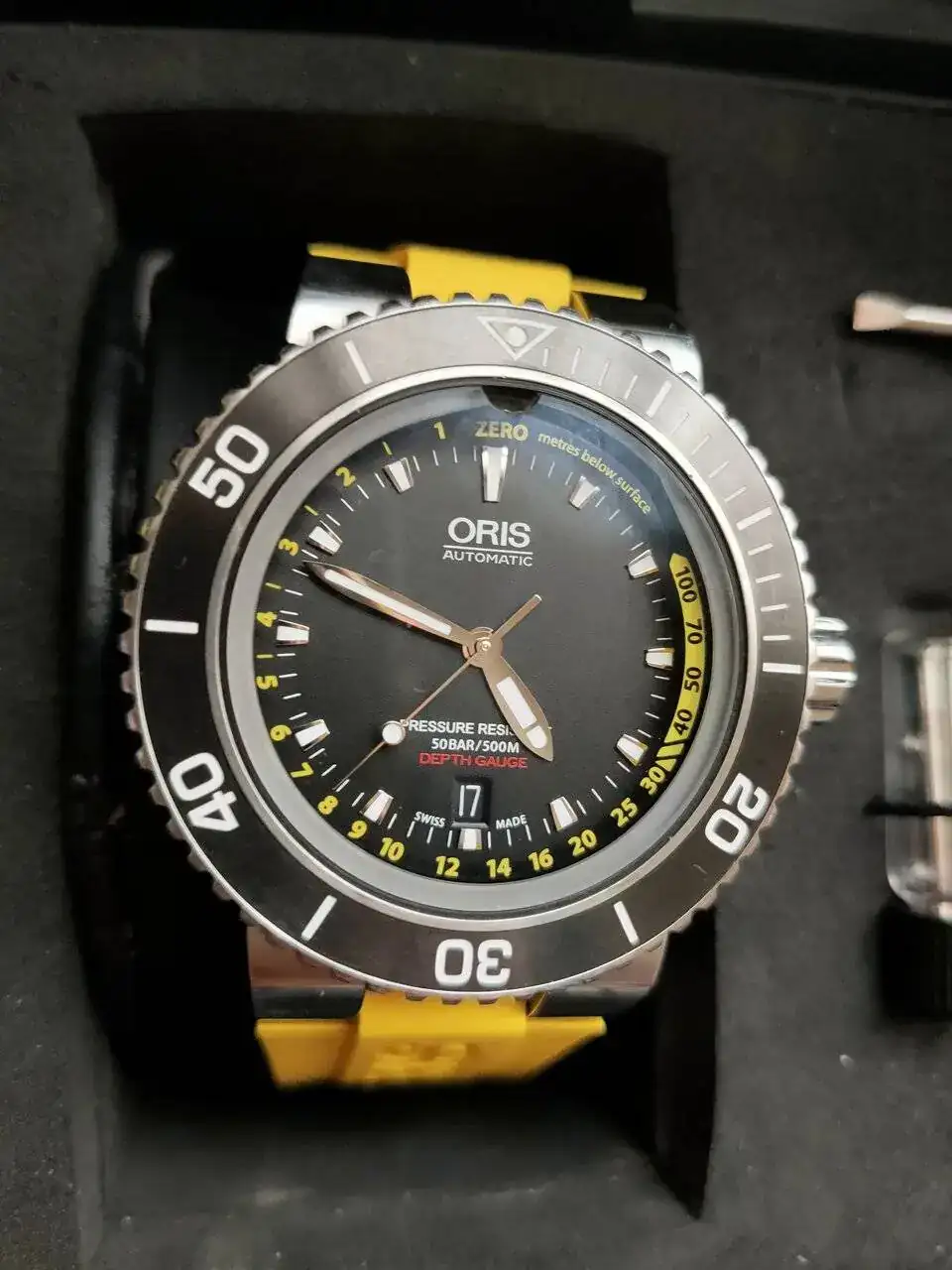 Muy a mi pesar y solo por problemas familiares y necesidad económica vendo este reloj herramienta Oris Depth gauge del año 2016 con su característico medidor de profundidad basado en la ley de Boyle-Mariotte. la verdad que en mi opinión es un relojazo con un a calidad contrastada.