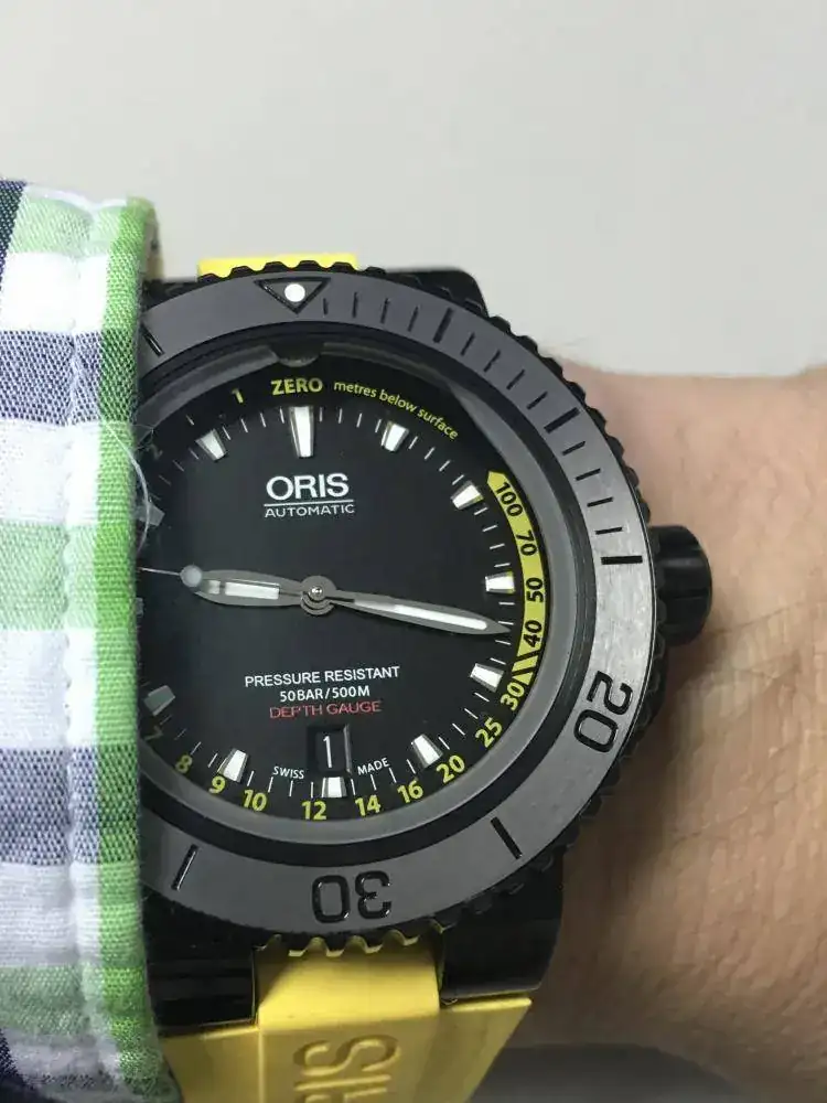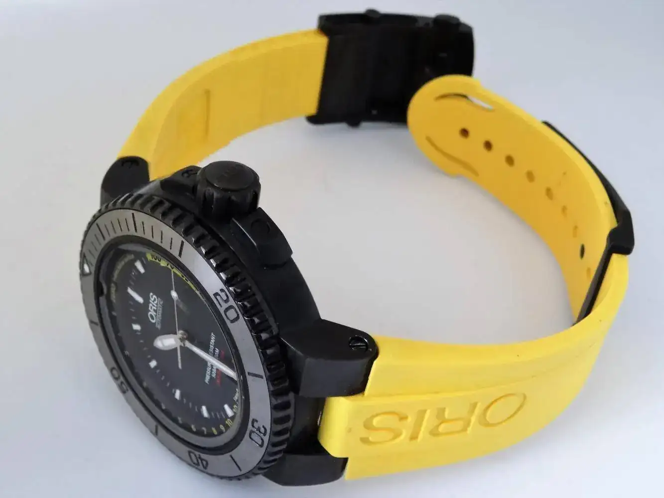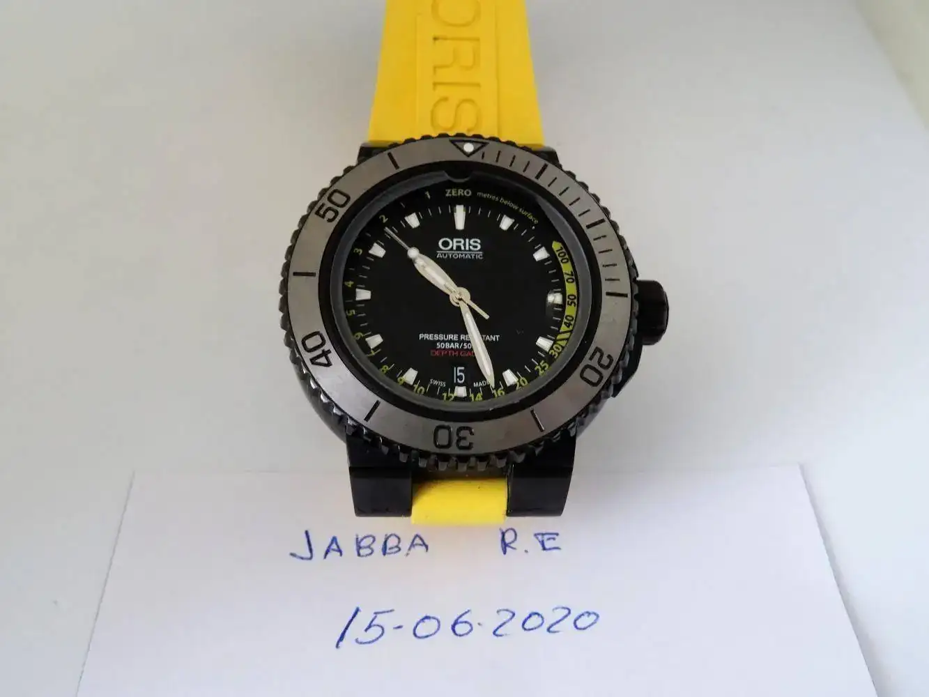 Buenos días compañero, con mucho pesar pongo a la venta unos de los relojes mas espectaculares y bonitos que han pasado por mis manos, el Oris Depth Gauge en su versión dlc con caucho amarillo. Las correas de caucho van con deployante, son de una calidad excepcional y tienen extensión de buceo muy cómoda