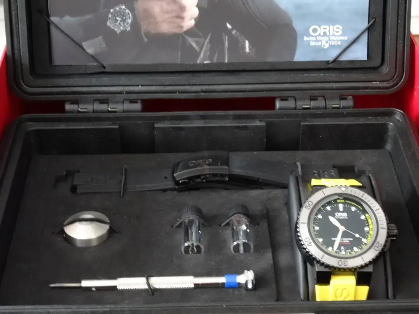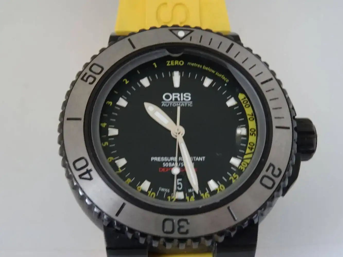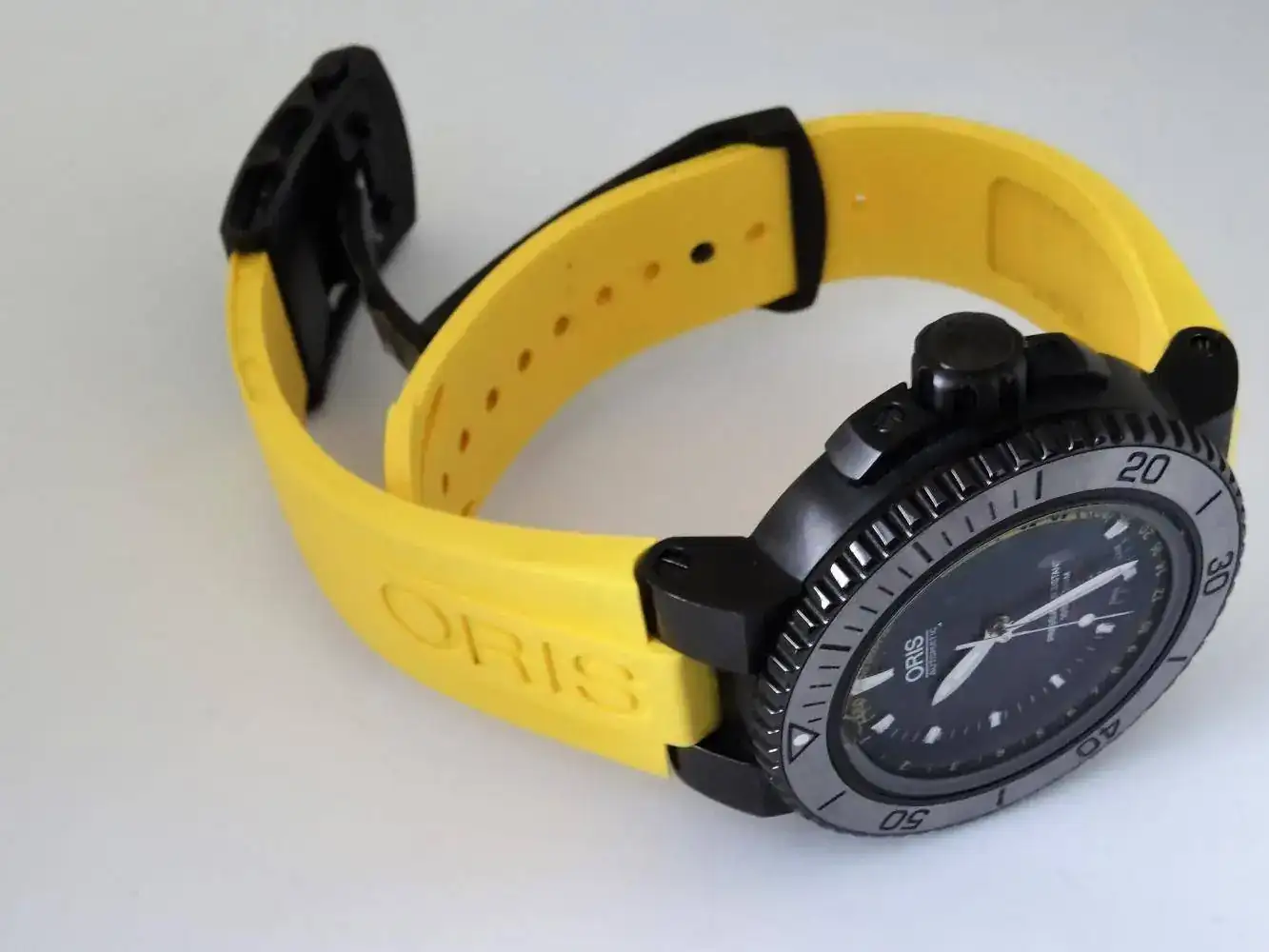 Buenos días compañero, con mucho pesar pongo a la venta unos de los relojes mas espectaculares y bonitos que han pasado por mis manos, el Oris Depth Gauge en su versión dlc con caucho amarillo. Las correas de caucho van con deployante, son de una calidad excepcional y tienen extensión de buceo muy cómoda