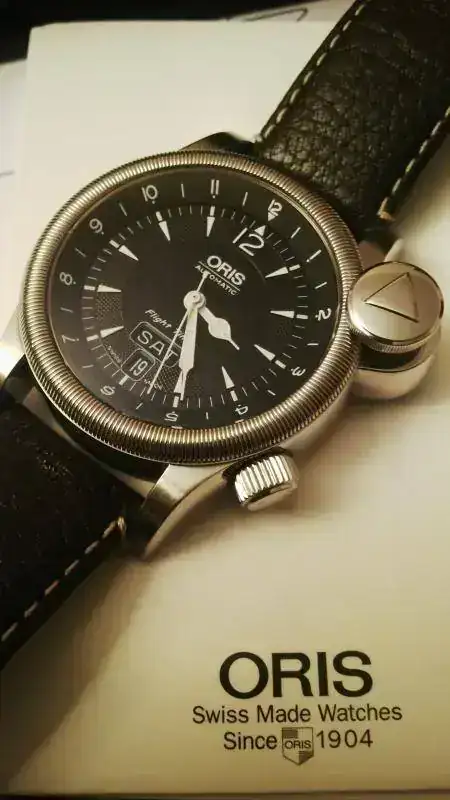 Ante la inminente llegada de piezas nuevas, me veo en la obligación de ir sacando alguna para hacer hueco. En este caso le toca a este reloj tan peculiar, un Oris Flight Timer dual time. El reloj tiene caja de 42mm, zafiro, fondo visto y correa de piel. Su bisel interno gira gracias al pulsador que lleva situado a las 2 para fijar la segunda franja horaria.