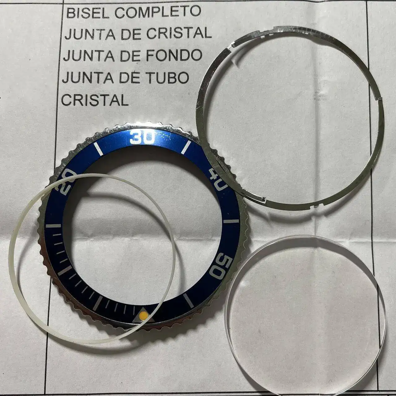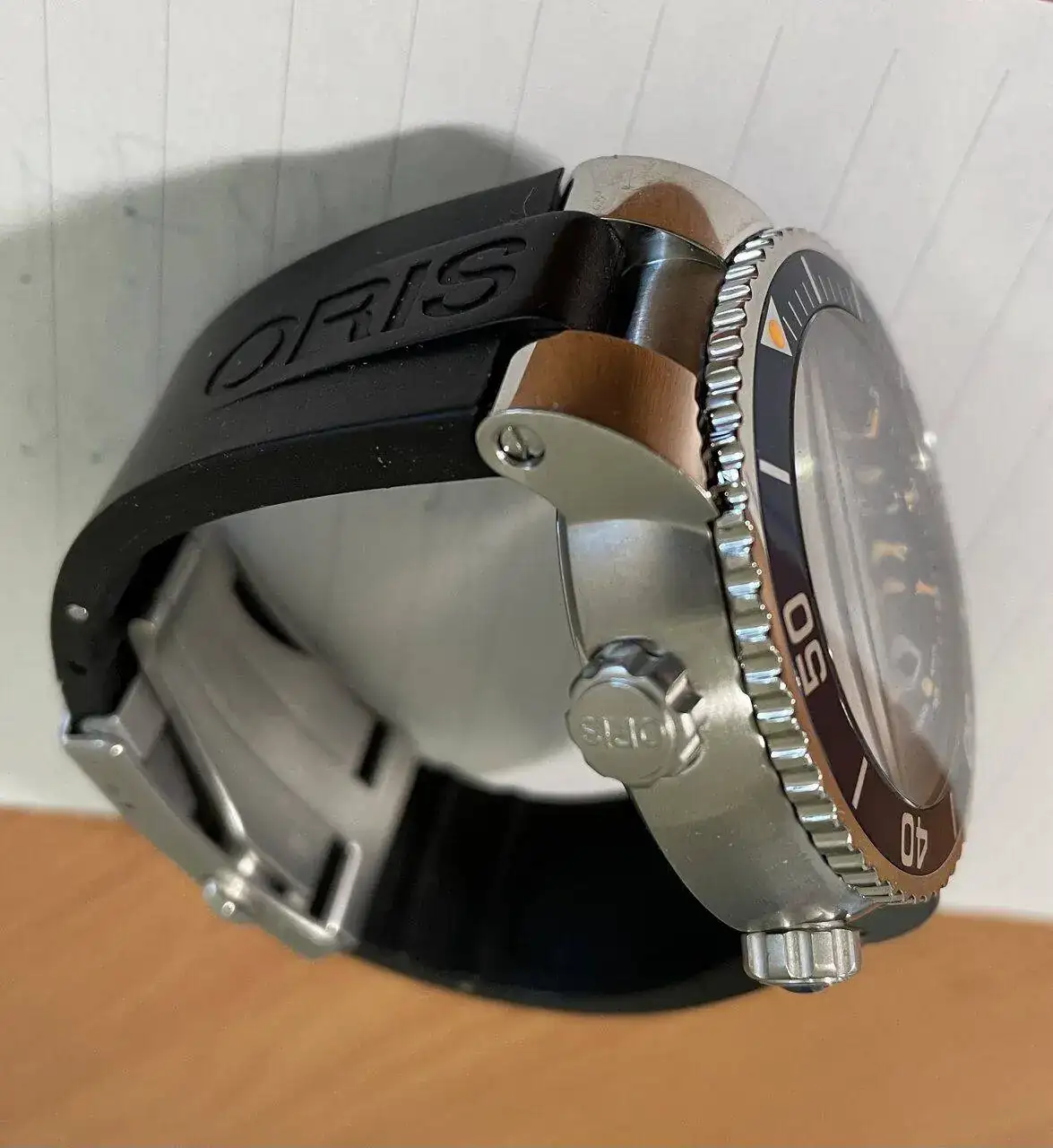 En la revisión se le ha realizado, además de la prueba de estanqueidad y la revisión completa, cambio de bisel completo, cambio de la junta de cristal, junta de fondo, junta de tubo, y cambio de cristal (todas las piezas son originales de ORIS).
