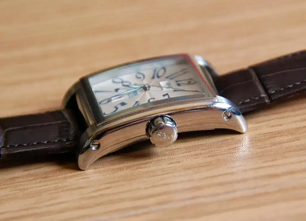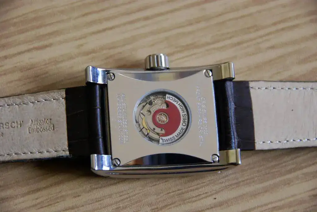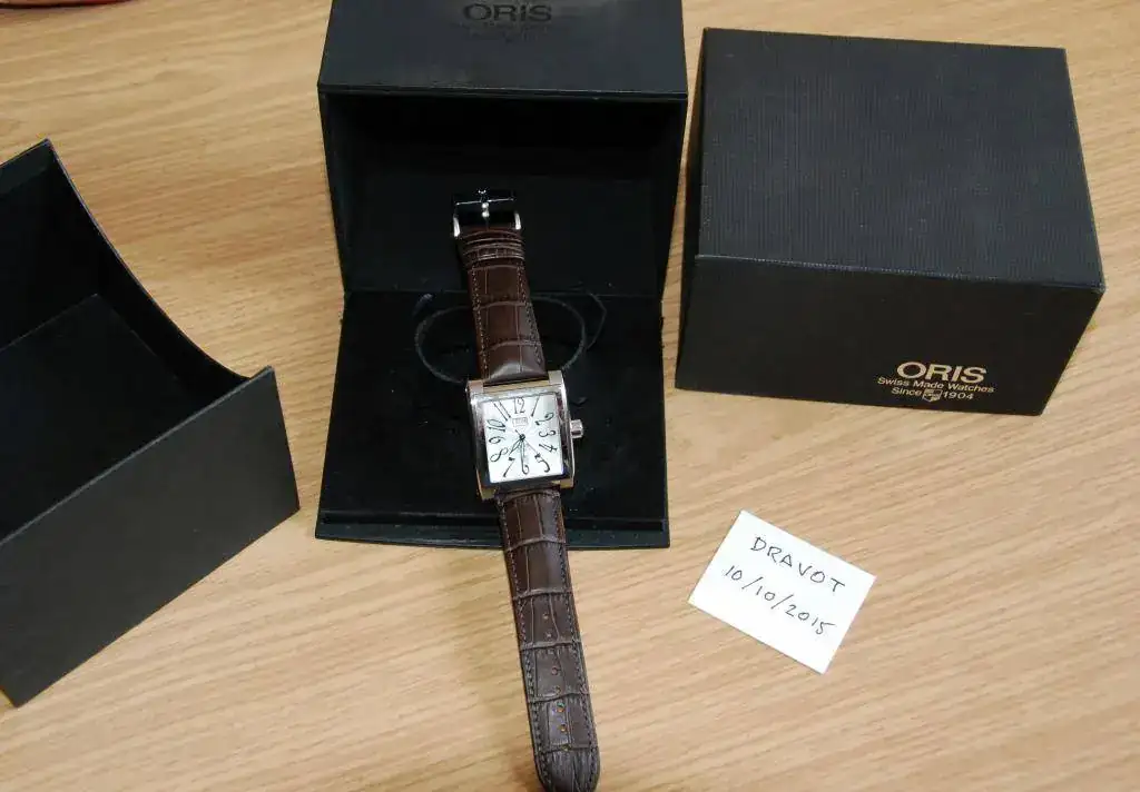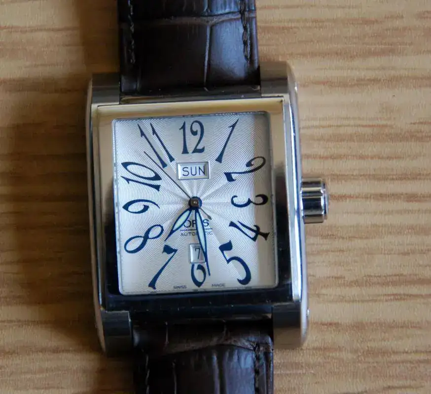 Hola, saco a la venta este elegante Oris RectangularDay-Date. Es un reloj usado y la terminación es a espejo, por lo que tiene algunospelillos superficiales, pero en general está muy bien. De marcha vaperfectamente. Se acompaña con una correa Hirsch Duke marrón completamentenueva, además del cierre desplegable Oris original.