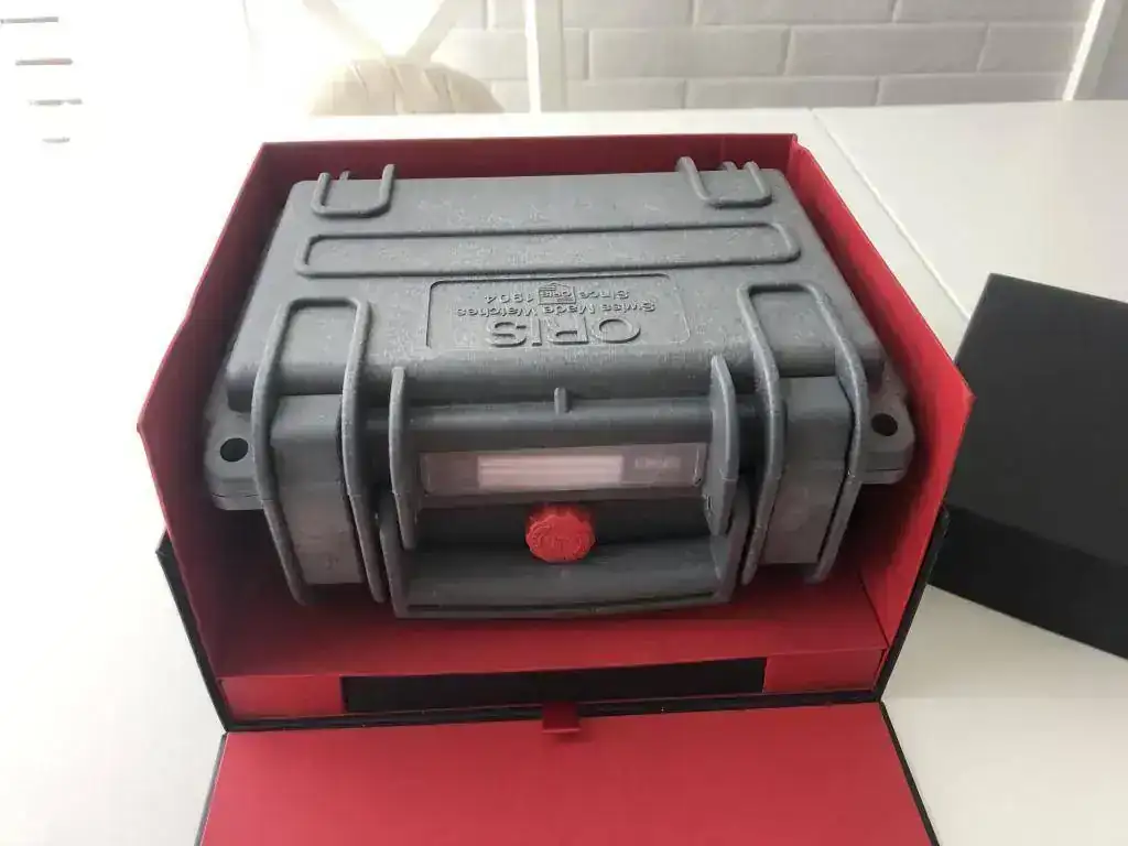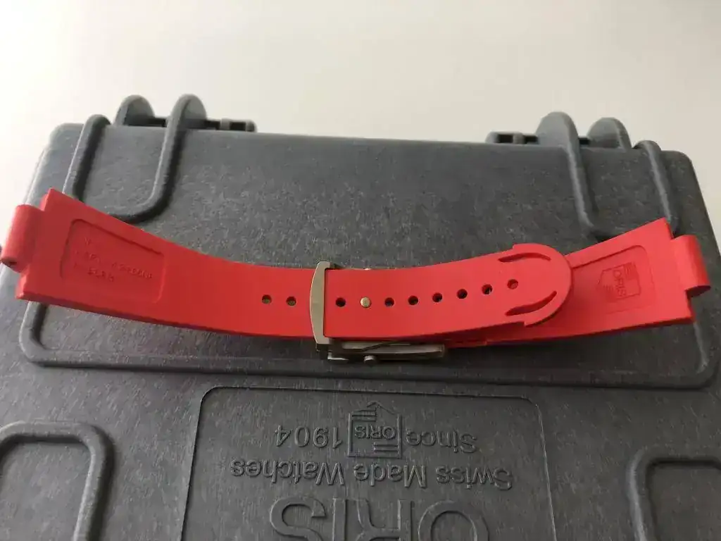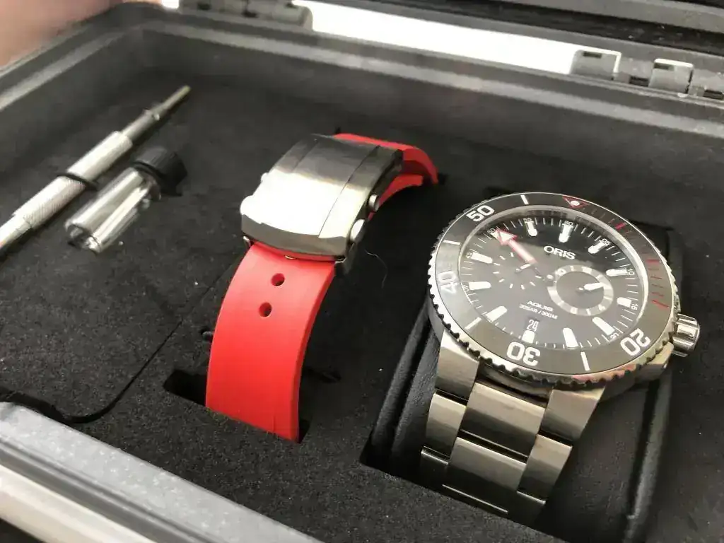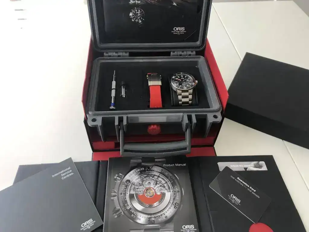 Por supuesto con todo su set; funda de cartón exterior, caja cartón negra (una esquina de la tapa está despegada, adjunto foto), caja tipo peli, documentación, manuales, tarjeta garantía debidamente cumplimentada, sellada y fechada; herramienta para cambio de correa, pasadores extra y caucho rojo.