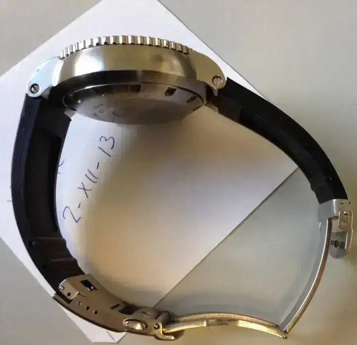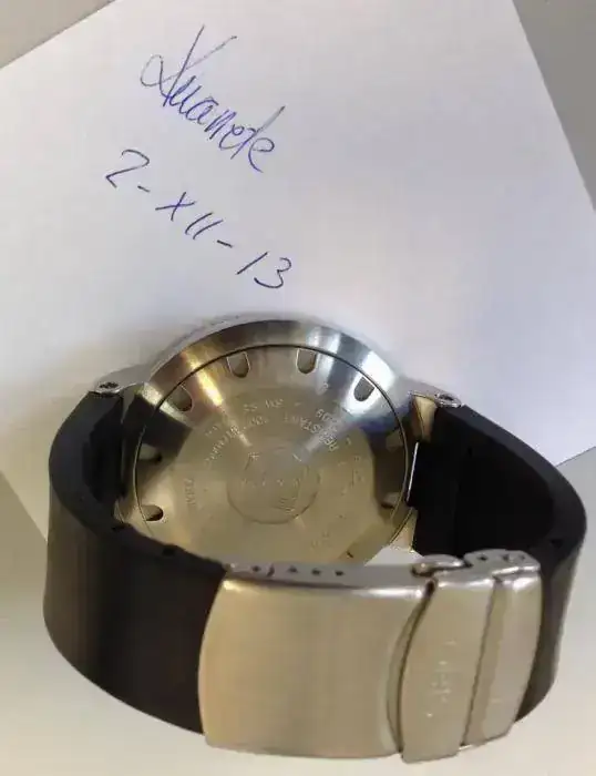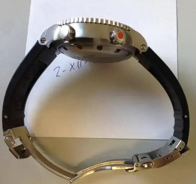 Repaso algunas de sus características: Caja de acero con 47mm de diámetro, movimiento automático, esfera y bisel negros con índices en naranja, cristal zafiro, brazalete de caucho ajustados a muñeca de 17,5cm.
