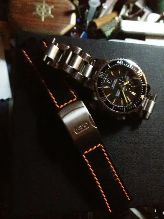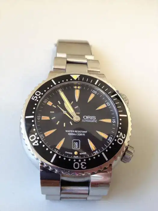 Todas sus características son de sobra conocidas, pero repaso algunas de ellas: Caja de acero con 47mm de diámetro, movimiento automático Oris, esfera y bisel negros con índices en naranja, cristal zafiro, brazalete de acero pulido-brillo con todos sus eslabones. Añado una correa de Jacobo con deployante de Oris en piel negra y pespunte naranja.