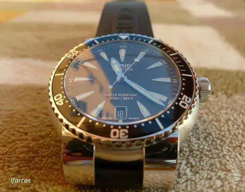 - Dial: Color negro con manecillas luminiscentes. Esfera decorada con olas y bisel giratorio numerado.