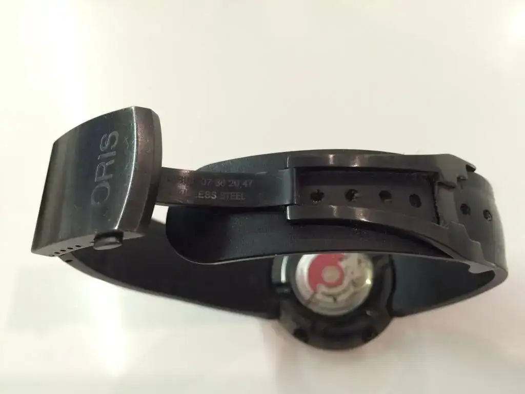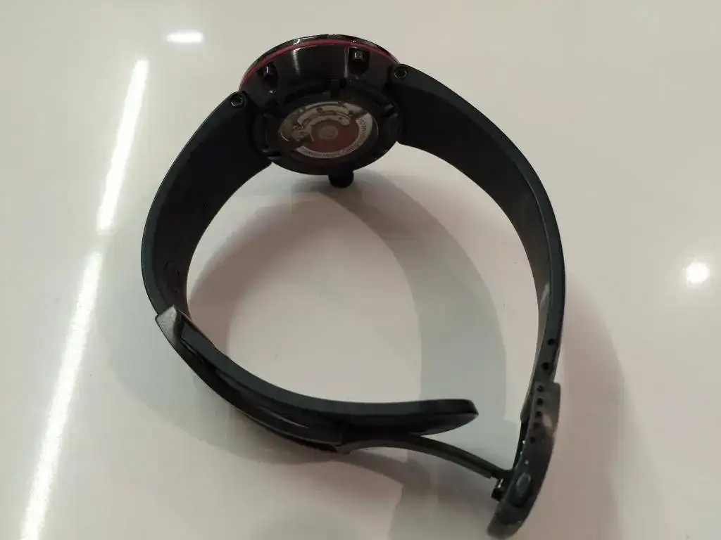 Lo primero, me gustaría dejar claro desde un principio que es un reloj usado: está en muy buen estado pero tiene un par de golpes en el borde del bisel, y como es negro lacado, pues se notan. Por favor, mirad atentamente las fotos, sobre todo entre las 6 y las 10 y entre las 3 y las 5. Por lo demás, cristal inmaculado y los típicos pelillos en el cierre. Si no fuera por esos golpes en el borde del bisel el reloj lo podía a un precio más elevado. De marcha va fenómeno y el caucho está muy bien.
