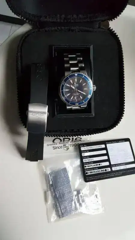 Se entrega con su documentación completa: cajas, estuche, la tarjeta de garantía sellada (caducada) y los eslabones sobrantes.