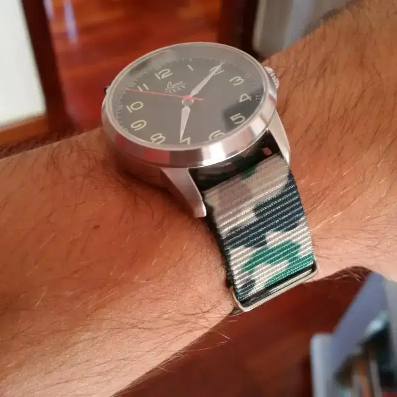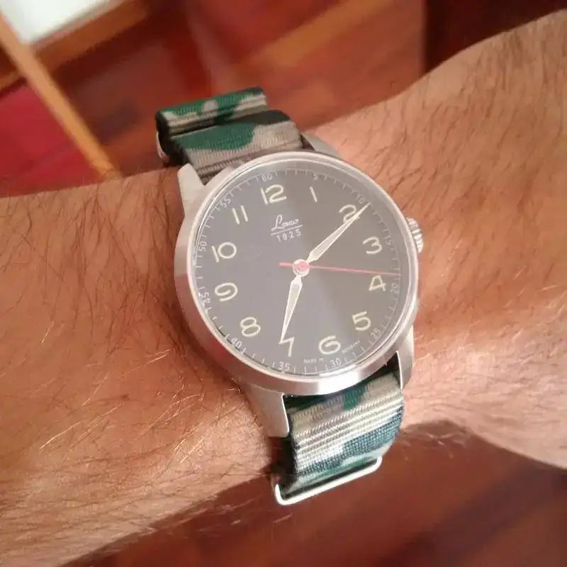 Este es el Laco, aquí lo teneis con una atrevida correa de camuflaje, es maquinaria miyota en una caja de 36mm, es un modelo que homenajea un Stowa que fue fabricado después de la guerra por los alemanes al ejército francés en compensación por la Segunda Guerra Mundial. No tiene fechador y posee un dial muy armonioso y militar.