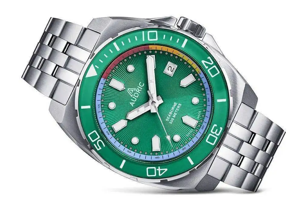 Sunburst pattern Sandwich Dial (minute markers in C3 Lume) with Matt background (Colors: Green, Light Blue, Gray, Deep Black and Cream Dial) and Applied indexes Rhodium plated (filled with white luminous BGW9 ).