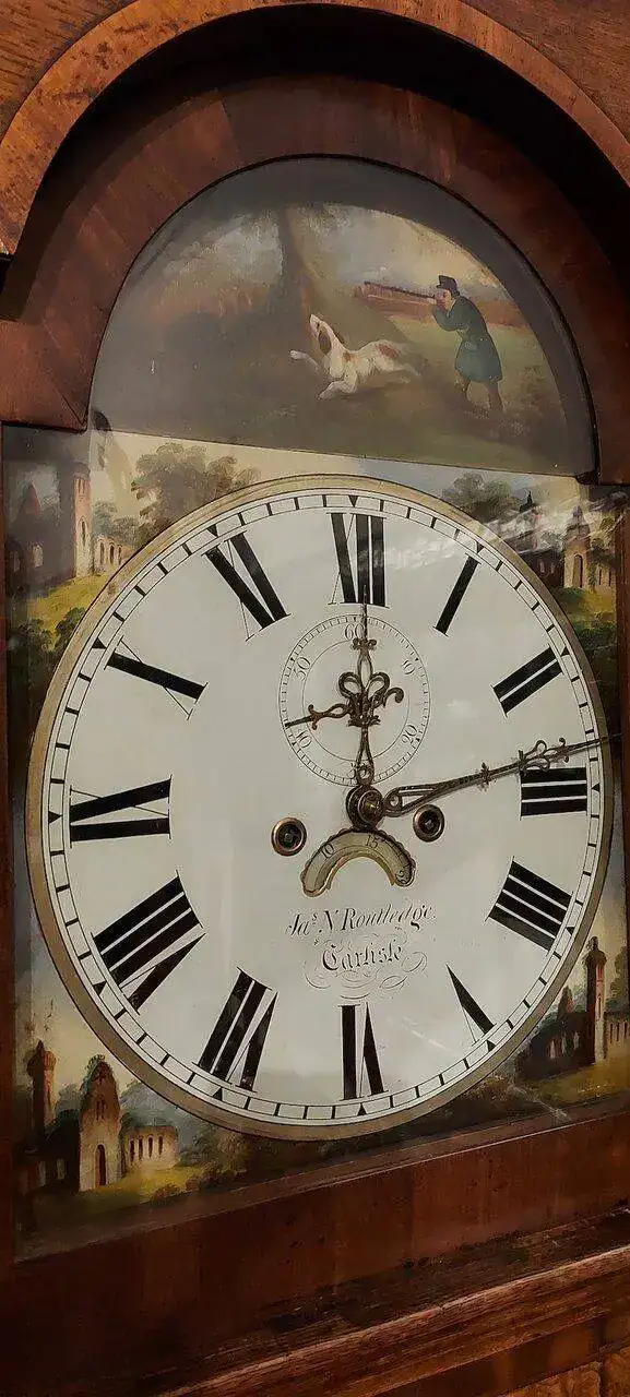 las esquinas del dial con motivos goticos, ruinas en este caso, siguiendo la moda del momento, y la escena de caza en el arco, lo situaría como muy tarde en 1870, estos motivos de escenas goticas y paisajes en las esquinas del dial, estuvieron desde 1830-1870 de moda, luego ya no siguieron, en cuanto a las escenas del arco pintadas, aparecen en 1820 hasta 1870, esto y el nombre del relojero que nuestro compañero Javirey te ha comentado te da una idea exacta del año del reloj, los numerales romanos en el siglo XIX se pusieron de moda otra vez desde 1825 hasta 1870, ya que en el periodo comprendido entre 1795-1825 se diseñaban con numerales arábigos.