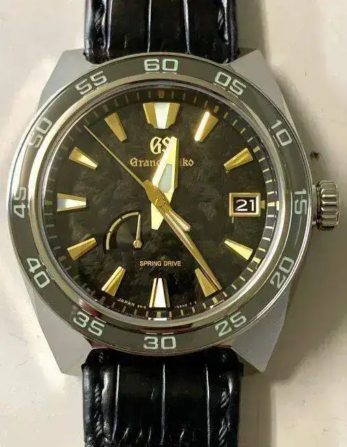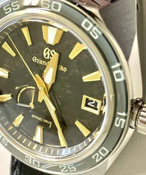 La máquina es la 9r15 de grand seiko movimiento sprint drive la esfera es igual al modelo SBGA 403,lo demás oro 24 k y el bisel de zafiro y la esfera es de papel waschirihi