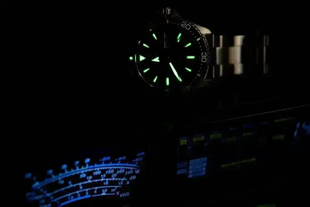 Otro aspecto positivo a tener en cuenta en este Kamasu es el Lumen. De todos es conocida la calidad de la hermana Seiko en este sentido, y pareciera que sus compañeros de Orient han robado la patente de algún cajón de Seiko. No he podido ponerlo de tú a tú con Seiko, referencia en este sentido, pero sí con el resto de mis relojes, y el resultado ha sido excepcional. Más allá de la comparativa, poco científica, lo cierto es que el lumen es intenso y duradero (dentro de unos márgenes, obviamente). Este es en tono verde, y si ha recibido suficiente energía lumínica permanecerá intenso durante unos buenos minutos. En mi caso la prueba de fuego ha sido mirar el reloj de noche en el coche, pudiendo ver la hora sin ningún tipo de problema, con un lumen débil, obviamente, pero suficiente. Y aunque precisamente en el coche no nos hará falta mirar el reloj para ver la hora, esas condiciones de casi nula luz me han servido para darme cuenta de que, llegado el caso, el kamasu tendrá lumen suficiente para ver la hora en casi cualquier entorno.
