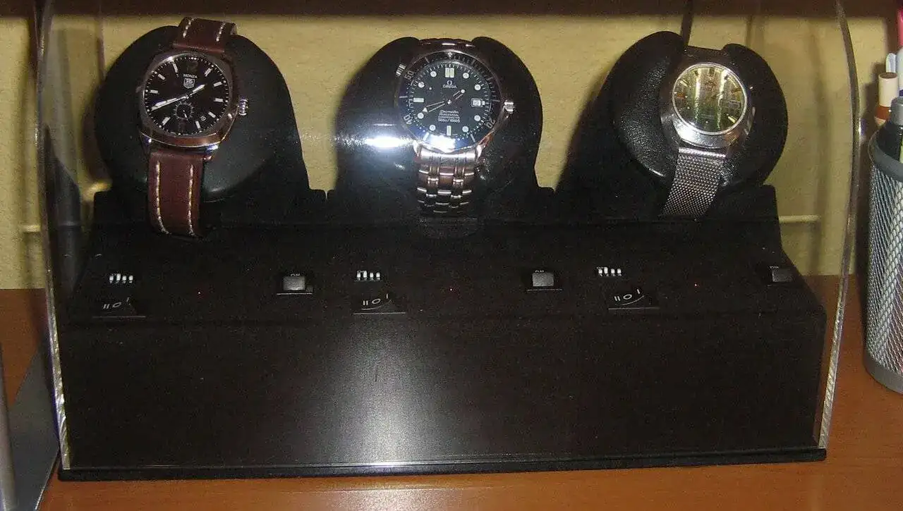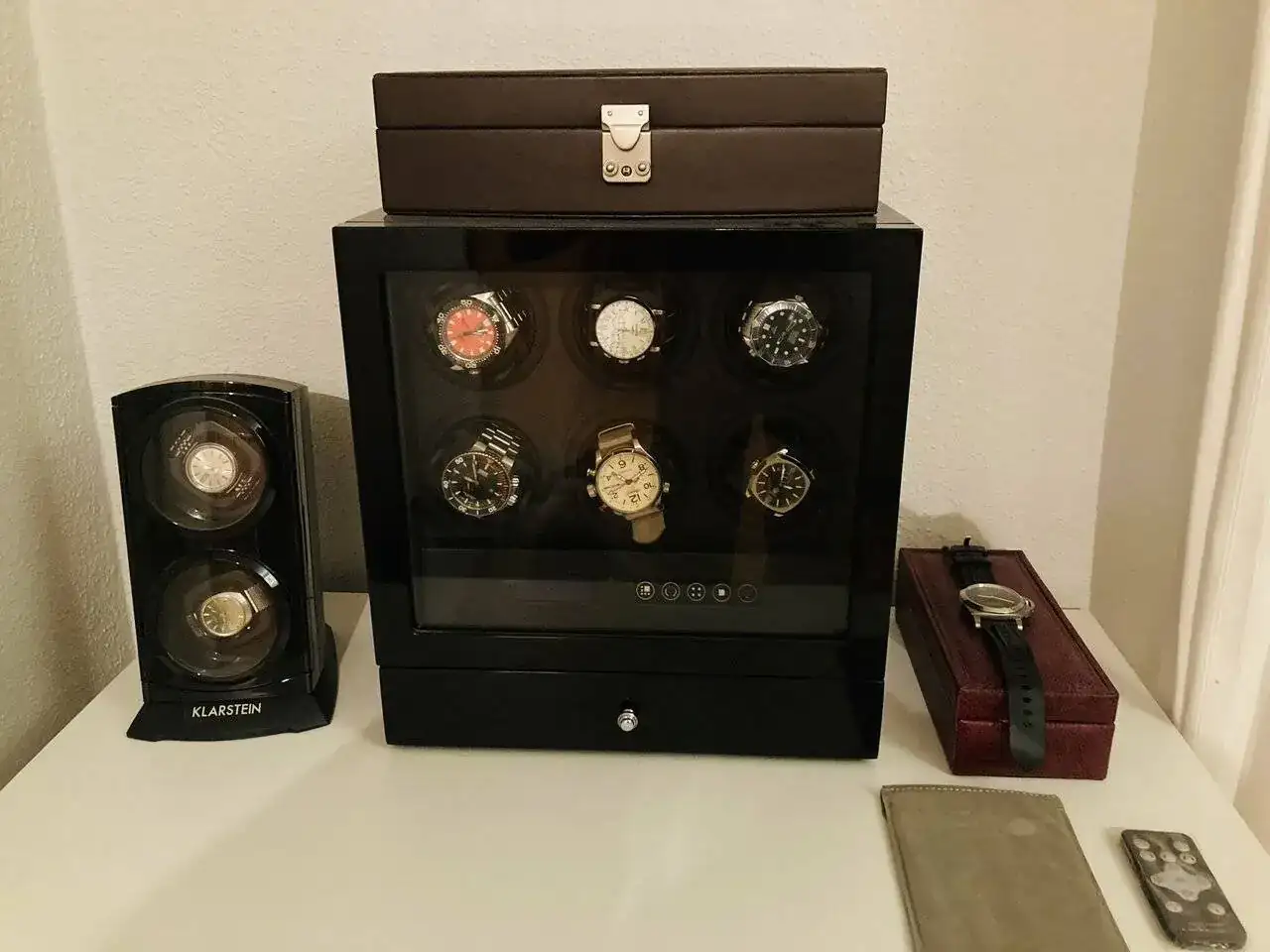 Para empezar, unas fotos con mis dos watchwinders, que tengo apagados y enciendo un par de días al mes. Otra locura más para disfrutar de las piezas que no llevo puestas. Del mueble estoy todo el rato cambiando piezas. Un Benson con seis motores japoneses independientes. En el otro suelen estar siempre mis dos vintages reparados de mi abuelo y mi padre.