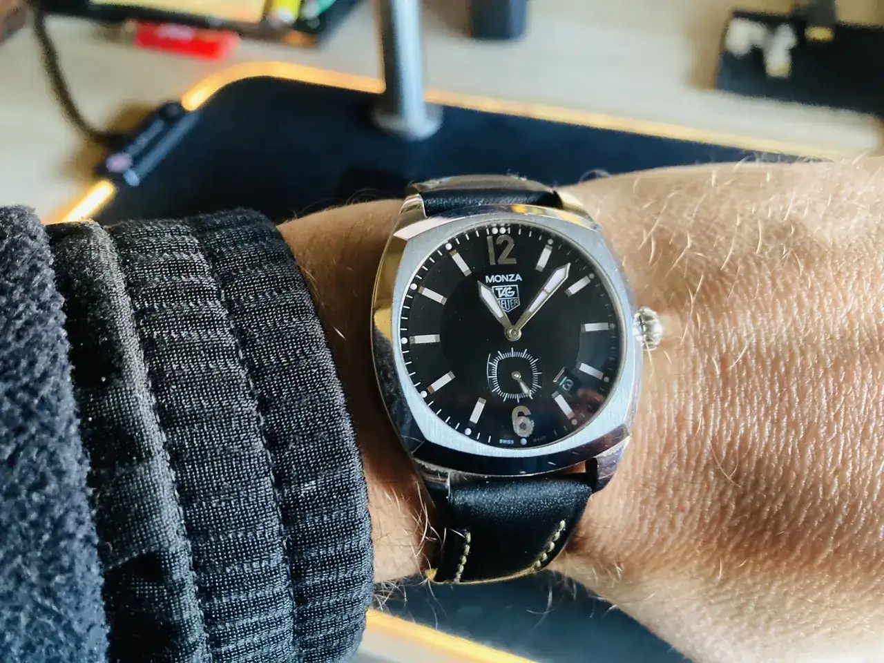 El segundo amor, TAG Heuer Monza. Este me lo regaló también la madre de mis hijos cuando nació el segundo, en 2005. Siempre me ha fascinado, más que el Mónaco (Sacrilegio!). Luego he visto que su diseño proviene de algún Rolex, pero me da igual. Evidentemente es menos versátil que su hermano mayor el Omega, y me lo he puesto menos. Pero los quiero por igual.