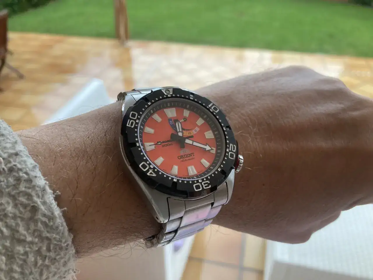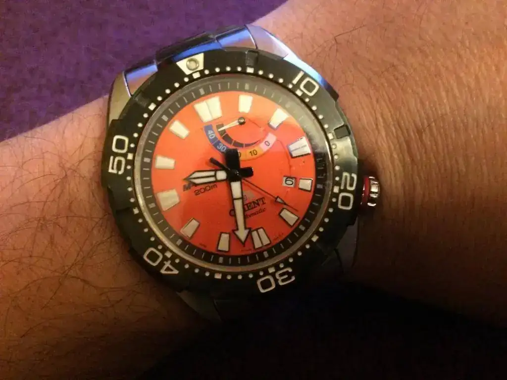 Y ahora vamos con mi paranoia horológica. Tenía mis Seiko y Orient familiares, y me entró la CRI de tener dos modelos de las mismas marcas, pero nuevos. El primero en llegar fue el Orient Bravo, con el bisel de acero en negro, y ese contador de reserva tan maravilloso! Que elegir entre el modelo azul, el negro... El naranja! Ese color de la esfera es hipnótico...