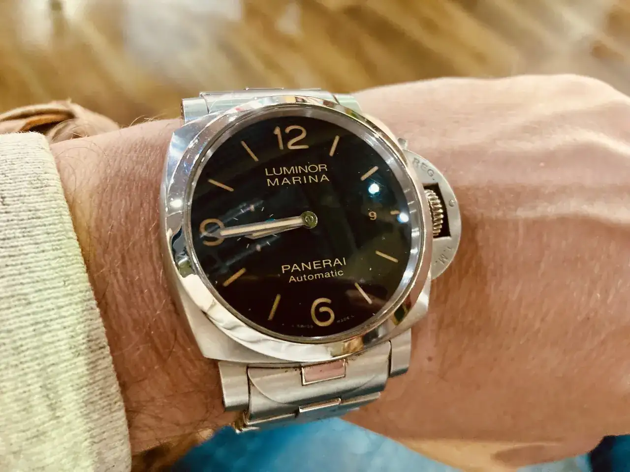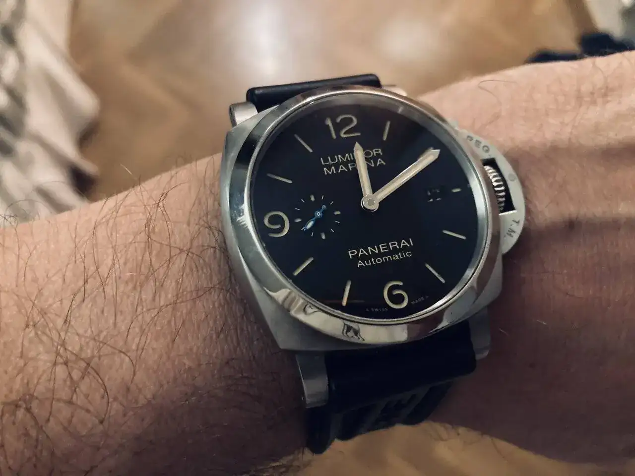 Y ahora vienen las palabras mayores, la joya de la Corona. La primera vez que vi un Panerai en una foto no me enamoré de él, fue lo siguiente. Yo tenía que tener uno algún día. Y he llegado a utilizar "homenajes" para comprobar tamaño y calibre con el que me iba a encontrar bien. Por fin llegué a la conclusión de que tenía que ser de 44mm (menos imposible en un Panerai y gracias a Dios tengo muñeca para llevarlo), automático (con cargar la cuerda de mi KMU 48 tengo suficiente) y con su dial negro sándwich con números árabes que para mi es algo principal. El elegido finalmente, un PAM723 que tuve que esperar dos semanas, para cogerlo con más ganas!!! Porque lo del armis se me ocurrió por el camino, y al final es todo un acierto, que cómodo! También tiene su caucho, y caerán más pantalones al tiempo.